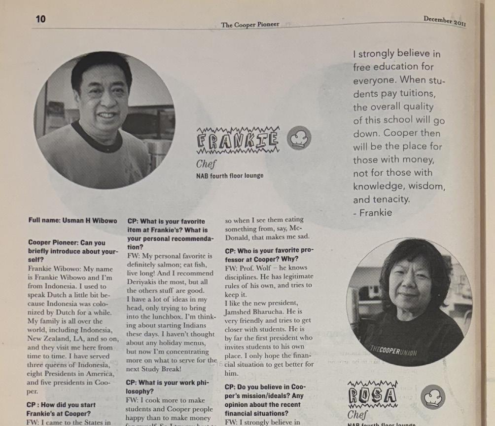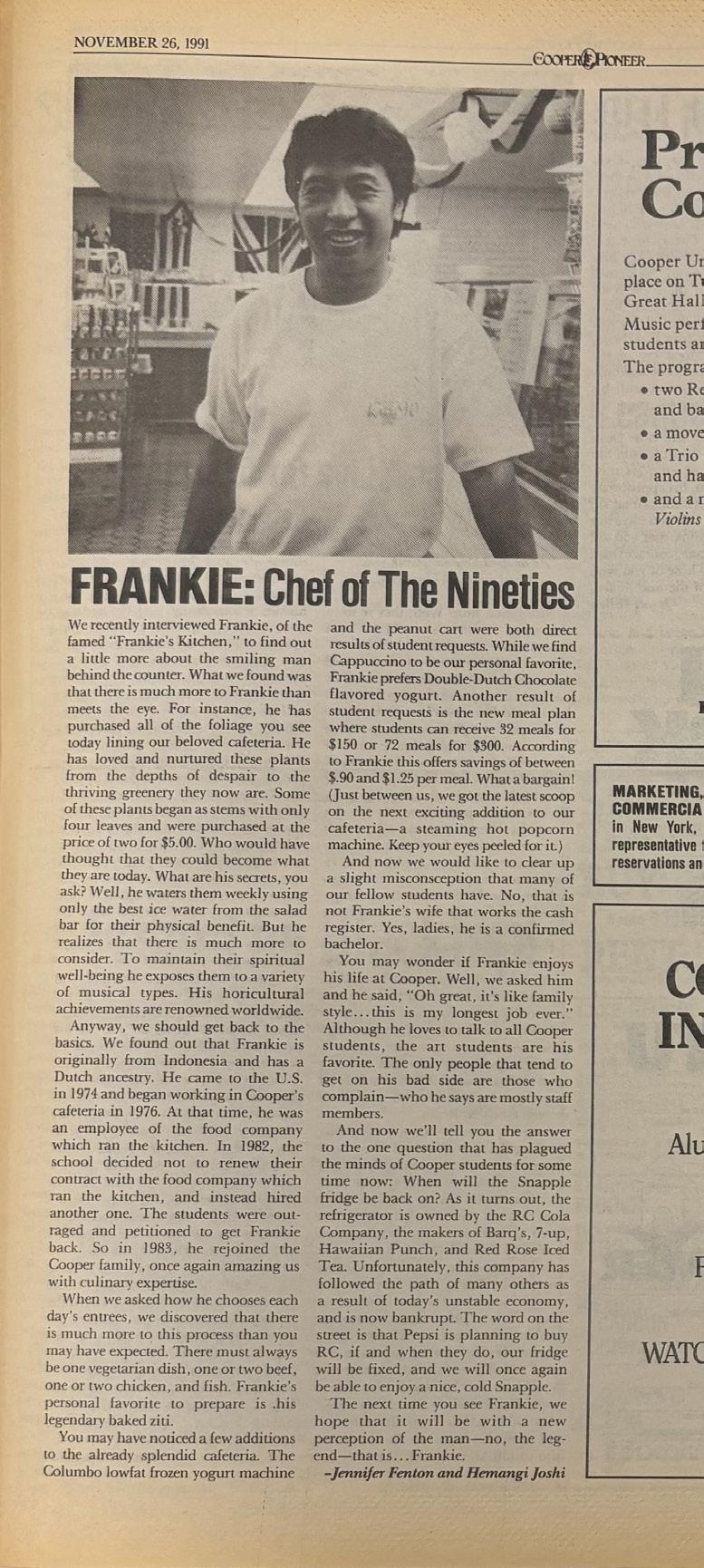 Originally from Indonesia, Frankie got his start in New York in the early 1970s, working as a dishwasher and learning to cook at an Italian restaurant. He joined Cooper in 1976 as an employee of Peter’s Pantry, the institution’s first full-service cafeteria, which opened that same year. Though not yet fluent in English, he quickly endeared himself to the students. They taught him the words for different deli meats and stood up for Frankie when he was scolded by his boss.