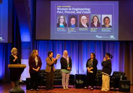 AND A PANEL OF COLLEGIATE AND PROFESSIONAL MEMBERS OF THE SOCIETY OF WOMEN ENGINEERS SHARING STORIES OF WOMEN IN ENGINEERING PAST, PRESENT, AND FUTURE.
