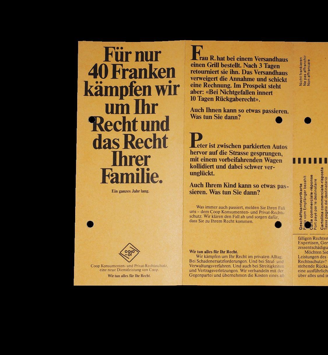 • Mit der Erweiterung des Versicherungsangebots, das sich aber weiterhin noch fast ausschliesslich an die Mitglieder der die Coop Rechtsschutz seit der Gründung als Aktionäre mittragenden Gewerkschaften, Angestelltenverbände und Genossenschaften beschränkte, und der sonstigen Geschichte der Coop Rechtsschutz bis Ende der 1980er-Jahre beschäftigt sich das nächste Kapitel.