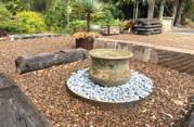 The front garden with a groovy Palm Springs vibe looks amazing! Other features include raked timber-lined ceilings, abundant windows to invite in natural light and frame vista, french doors with stained glass insets, split-system air-conditioning, ceiling fans, combustion fireplace, bespoke light fixture in kitchen handmade by owner from railway sleeper, private lagoon-style inground pool … and much more!