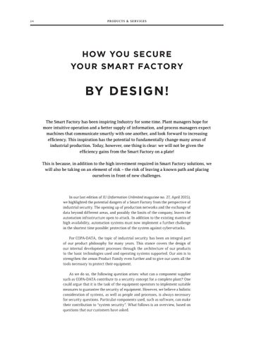 BY DESIGN! The Smart Factory has been inspiring Industry for some time. Plant managers hope for more intuitive operation and a better supply of information, and process managers expect machines that communicate smartly with one another, and look forward to increasing efficiency. This inspiration has the potential to fundamentally change many areas of industrial production. Today, however, one thing is clear: we will not be given the efficiency gains from the Smart Factory on a plate! This is because, in addition to the high investment required in Smart Factory solutions, we will also be taking on an element of risk – the risk of leaving a known path and placing ourselves in front of new challenges.