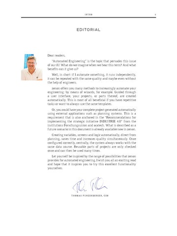 Dear readers, “Automated Engineering” is the topic that pervades this issue of our IU. What do we imagine when we hear this term? And what benefits can it give us? Well, in short: if I automate something, it runs independently, it can be repeated with the same quality and maybe even without the help of engineers. zenon offers you many methods to increasingly automate your engineering: by means of wizards, for example. Guided through a user interface, your projects, or parts thereof, are created automatically. This is most of all beneficial if you have repetitive tasks or want to always use the same templates. Or, you could have your complete project generated automatically using external applications such as planning systems. This is a requirement that is also anchored in the “Recommendations for implementing the strategic initiative INDUSTRIE 4.0” from the institutions Forschungsunion and acatech. What is described as a future scenario in this document is already available now in zenon. Creating variables, screens and logic automatically, direct from planning, saves time and increases quality simultaneously. Once configured correctly, centrally, the system always works with the same data source. Reusable parts of projects are only checked once and can then be used many times. Let yourself be inspired by the range of possibilities that zenon provides for automated engineering. I wish you all an exciting read and hope that it inspires you to try this excellent functionality yourselves.