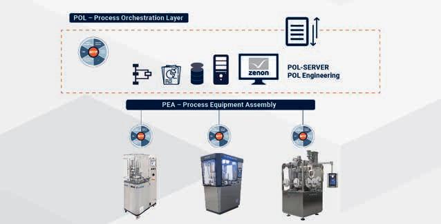 Sämtliche PEAs liefern Informationen in einem standardisierten Format, unabhängig vom Prozessleitsystem. Dies ermöglicht das Integrieren dieser PEAs in eine übergeordnete Prozessorchestrierungsebene (Process Orchestration Layer, POL), siehe Abbildung 2. Durch den Import sowie die Verbindung der verschiedenen Module mittels einer Prozessorchestrierung ist die POL nun in der Lage, alle Module darzustellen und zu überwachen. Chargenrezepte nach der Norm ISA-88 können mithilfe der durch die verschiedenen Module oder PEAs angebotenen Dienste erstellt werden. Nach Abschluss der Produktion können die Module neu angeordnet werden, um eine weitere Charge über eine unterschiedliche Sequenz zu produzieren. Für die Kommunikationsebene zwischen den PEA- und POL-Ebenen wurde OPC UA ausgewählt, ein weithin anerkannter Standard.
