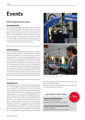 Automatica 2006 Simply a MUST for everyone interested in robotics and automation. 800 participating companies from 38 countries presented their innovations. This year the visitors got to see something special: the Automatic Bar. A bar that automatically mixed cocktails and served drinks to visitors – developed by the technical college in Vienna in cooperation with COPA-DATA and the companies Keba, Epson Germany, Montech and Motoman Robotec. Students of the technical college specializing in Mechatronics and Robotics had, together with the above-mentioned companies, created the fully automatic bar for the expo-organizer Automatica. By the click on the Keba touchscreen that showed visualizing solutions by COPA-DATA, the visitors could choose and order drinks. The cool beer is poured and served by two Montoman-Robots, while the Cocktail Robot built by Epson can mix sixteen different cocktails. Thanks to the sophisticated
