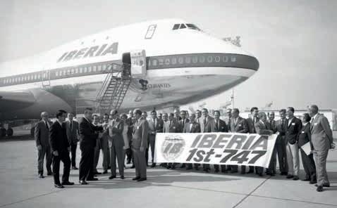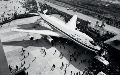invirtió hasta el último dólar en ese avión de dimensiones jamás vistas hasta entonces. El futuro de la empresa fue incierto durante meses. De hecho, en algunos carteles cerca de la factoría de Boeing se podía leer “El último que apague la luz”, ya que no todo el mundo parecía convencido del éxito del programa. Sin embargo, el tiempo les hizo ver que no tenían razón, ya que el sector de la aviación comercial acabó creciendo un 15% anual. El diseño del B747-100 fue una verdadera hazaña de ingeniería, y presentó varias innovaciones tecnológicas, como el uso de un ala de alta eficiencia y motores de reacción de alta potencia. Estos componentes permitieron al B747-100 alcanzar velocidades de crucero de hasta Mach 0,85, lo que lo convierte en uno de los aviones más rápidos de su época. En términos de rendimiento, el B747-100 fue muy eficiente, con un alcance de más de 9.500 kilómetros. Esto permitió a las aerolíneas utilizar el avión en rutas de larga distancia, como vuelos transatlánticos y transpacíficos. El avión también contaba con una cabina muy cómoda para los pasajeros, con una altura de techo más alta que otros aviones de su época, lo que daba una sensación de amplitud y espacio. También fue el primer avión comercial en contar con una cabina de vuelo de vidrio. Con una longitud de 70,6 metros y una envergadura de 59,6 metros, tiene una configuración típica de tres clases y puede transportar