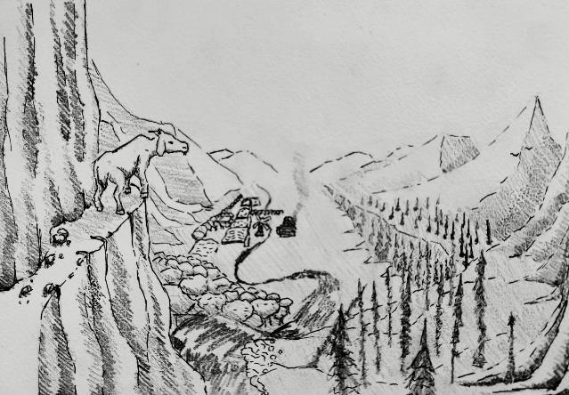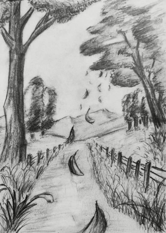 auf einem kleinen A5? von Anja Vorwerk Im Oberstufenkurs Kunst (Jg. 12 und 13) haben die Schüler*innen zuletzt Mittel und Möglichkeiten erprobt, eine möglichst große räumliche Tiefe darzustellen. Lea und Gerrit ist dies überaus gut gelungen. In Gerrits Zeichnung führt ein Weg den Betrachtenden in die Weite, während der Wind sanft Blätter herumwirbelt und die Bäume an den Seiten sanft rauschen lässt. Bei Leas Zeichnung schauen wir einer wagemutigen Ziege zu, welche an einer steilen Felswand verweilt und ins weite Tal hinabschaut, in welches sich von oben ein Fluss zu einer kleinen Siedlung hinabschlängelt.