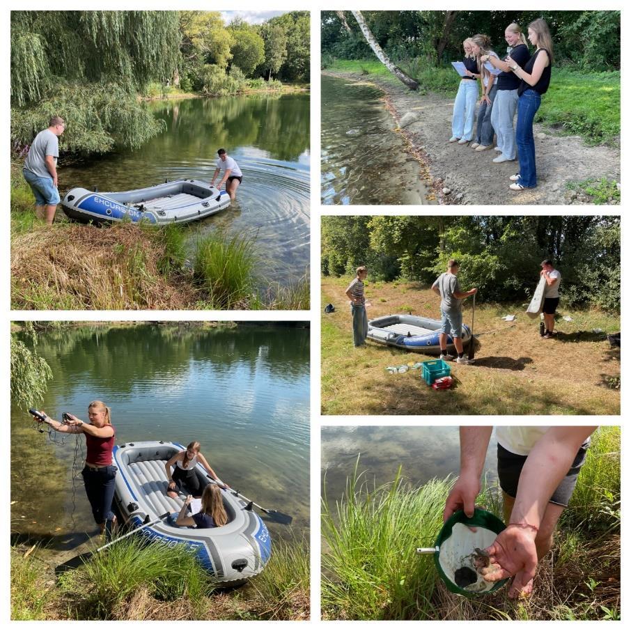 Exkursion zum Elberger See. Auf und den See wurden zahlreiche Untersuchungen durchgeführt und Beobachtungen gemacht. Vom Schlauchboot aus konnte mithilfe eines Lotes ein Tiefenprofil für den See erstellt werden. Auch Temperatur - und Lichtmessungen wurden so in verschiedenen Ber eichen und Schichten des Sees möglich. Die vielfältige Flora und Fauna wurde ebenfalls untersucht – selbstgefangene Krebse und Aussagen von gerade anwesenden Anglern gaben Einblicke in die tierischen Bewohner des Gewässers.
