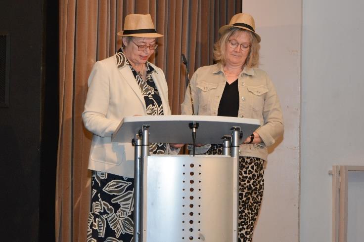 Danach sprachen die Schulelternratsvorsitzenden Frau Gerdes -Budde und Frau Kathmann zur Festgemeinde, welche mit Dschungelhut und in Animal Print auf die Bühne traten und somit nicht nur in ihrer Rede, sondern auch mit ihrem Outfit Bezug zum Abi-Motto „Abi vs. wild – 13 Jahre Überlebenskampf“ nahmen. Auf amüsante Weise verschafften sie den Anwesenden einen Einblick in die zurückliegende, tierisch wilde Oberstufenzeit der Abiturientia 2025.