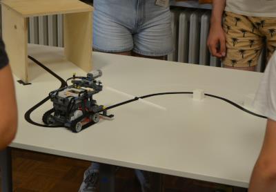Der Roboter muss der Linie folgen, darf im Tunnel nicht anecken, muss aber so breit sein, dass er die weißen Würfel auf der Bahn mitnimmt und an einer Wand am Ende liegen läßt und allein wieder zurückfährt. In diesem Wettbewerb konnte das Team JJT mit Jan Hanneken, Jan Schwarte und Tim Benten (Realschule) eine saubere Fahrt hinlegen, wobei nur 5 Sekunden auf den dritten Platz fehlten.