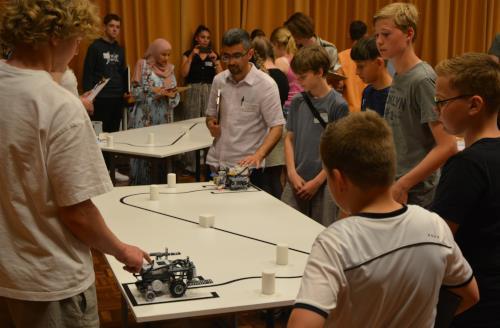 Hier ging es darum, mit dem Roboter an den Bällen vorbeizufahren und nur die schwarzen Bälle von der Platte zu stoßen. Gerade in dieser schwierigsten Disziplin holten sich Merle und Paul den zweiten Platz.