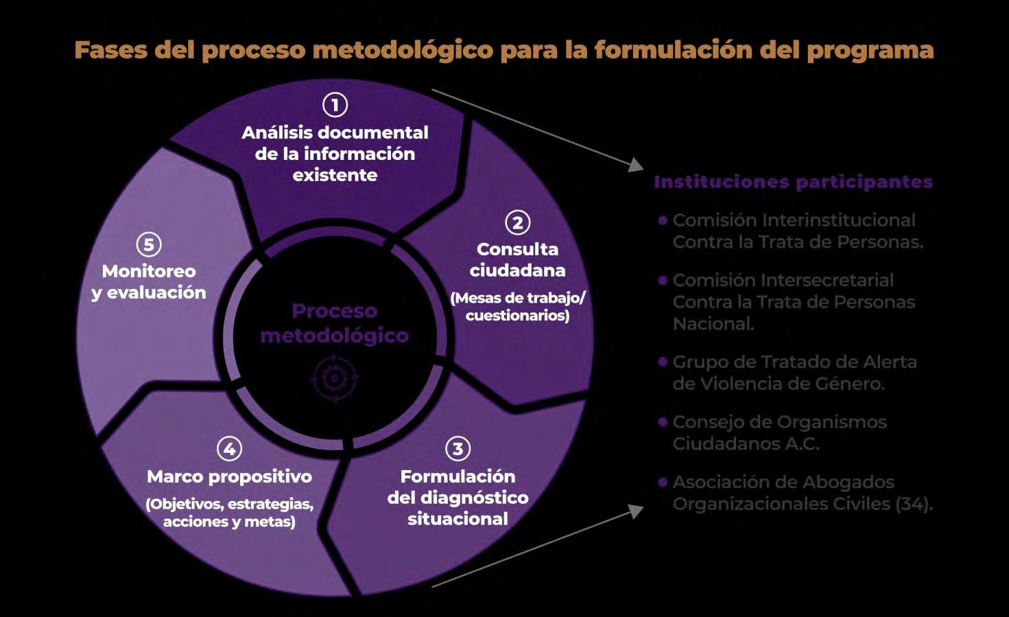 En cumplimiento al articulado antes citado, el Gobierno del Estado de Baja California, instaló, el 15 de diciembre del 2021, la Comisión Interinstitucional Contra la Trata de Personas, cuyos integrantes, en ejercicio de sus atribuciones, trabajaron de forma inmediata en la elaboración del presente Programa Estatal para Erradicar los Delitos en materia de Trata de Personas y para la Protección y Asistencia a las Víctimas de estos Delitos, instrumento rector en materia de trata de personas; con una metodología alineada a los criterios para elaborar los programas derivados del Plan Estatal de Desarrollo 2022-2027, a los principios rectores y a las directrices del Plan Nacional de Desarrollo 2019-2024, al Programa Sectorial de Gobernación 2020-2024, al Programa Nacional para Prevenir, Sancionar y Erradicar los Delitos en Materia de Trata de Personas y para la Protección y Asistencia a las Víctimas de estos Delitos, al Plan Estatal de Desarrollo 2020-2024, así como a la Agenda 2030 para el Desarrollo Sostenible. Cuenta con un marco jurídico normativo, un entorno situacional derivado de investigación