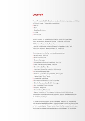 COLOFON Power Products Mobile Solutions représente les marques des sociétés, affiliées à Power Products LLC, suivantes : ANCOR BEP Blue Sea Systems CZone Mastervolt Design et mise en page Coppia Creatief Collectief, Pays-Bas Texte : Mastervolt et Coppia Creatief Collectief, Pays-Bas Publication : Mastervolt, Pays-Bas Photo de couverture : Mike Muizebelt Photography, Pays-Bas Photo des produits : Webfotografie.nl, Pays-Bas Remerciement particulier aux sociétés suivantes : Action Mobil, Autriche Azimutel, Espagne Brock, Allemagne Doma Elektro Engineering GmbH, Autriche Empl Fahrzeugwerk GmbH, Autriche Geesinknorba,Pays-Bas Hartmann Spezialkarosserien, Allemagne IDTechnology, Pays-Bas Ketterer Spezialfahrzeuge GmbH, Allemagne Maisonneuve Sas, France EspPanatec, Espagne Rosenbauer International AG, Autriche Schuler Fahrzeugbau GmbH, Allemagne Sea Hun610 KFT, Mer Hongrie Stephex, Belgique Thurm Media, Allemagne Walter Bösenberg Fahrzeugeinrichtungen GmbH, Allemagne Ainsi qu’aux nombreuses autres sociétés pour la mise à disposition de matériel graphique. Le matériel contenu dans ce catalogue est présenté de bonne foi à titre d’information générale et l’engagement d’aucune responsabilité ne sera accepté pour des pertes ou frais résultants de circonstances particulières fondées sur des éléments énoncés dans ce catalogue.