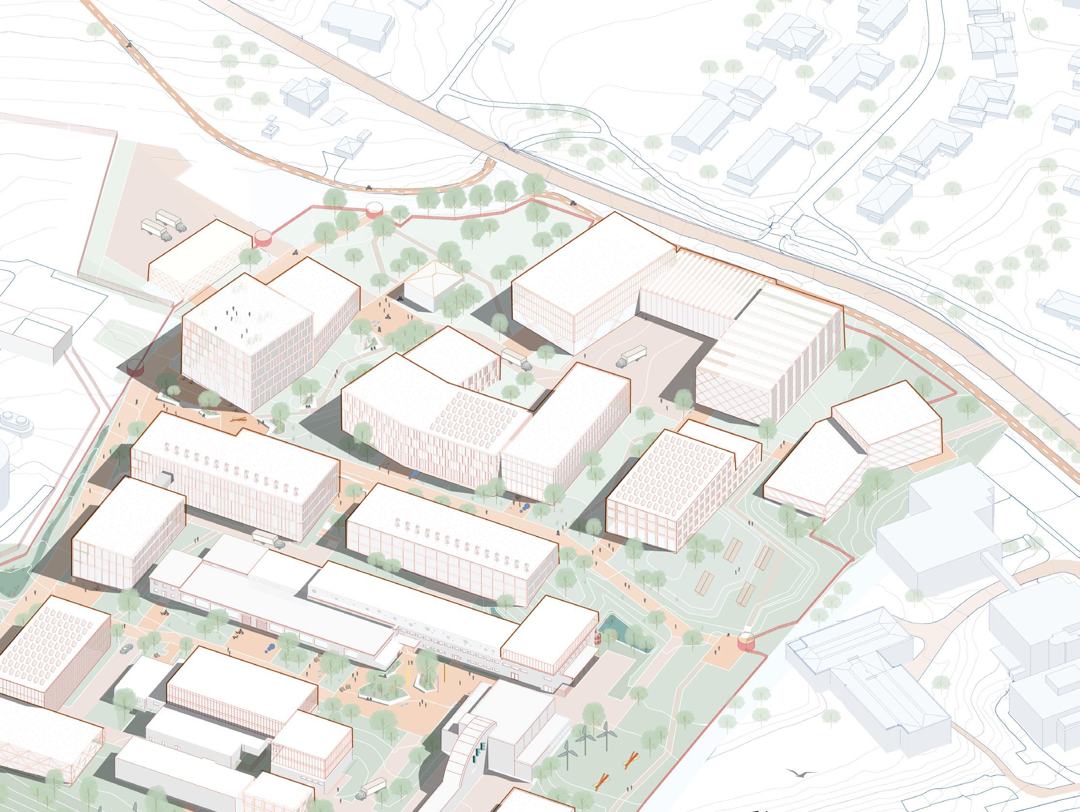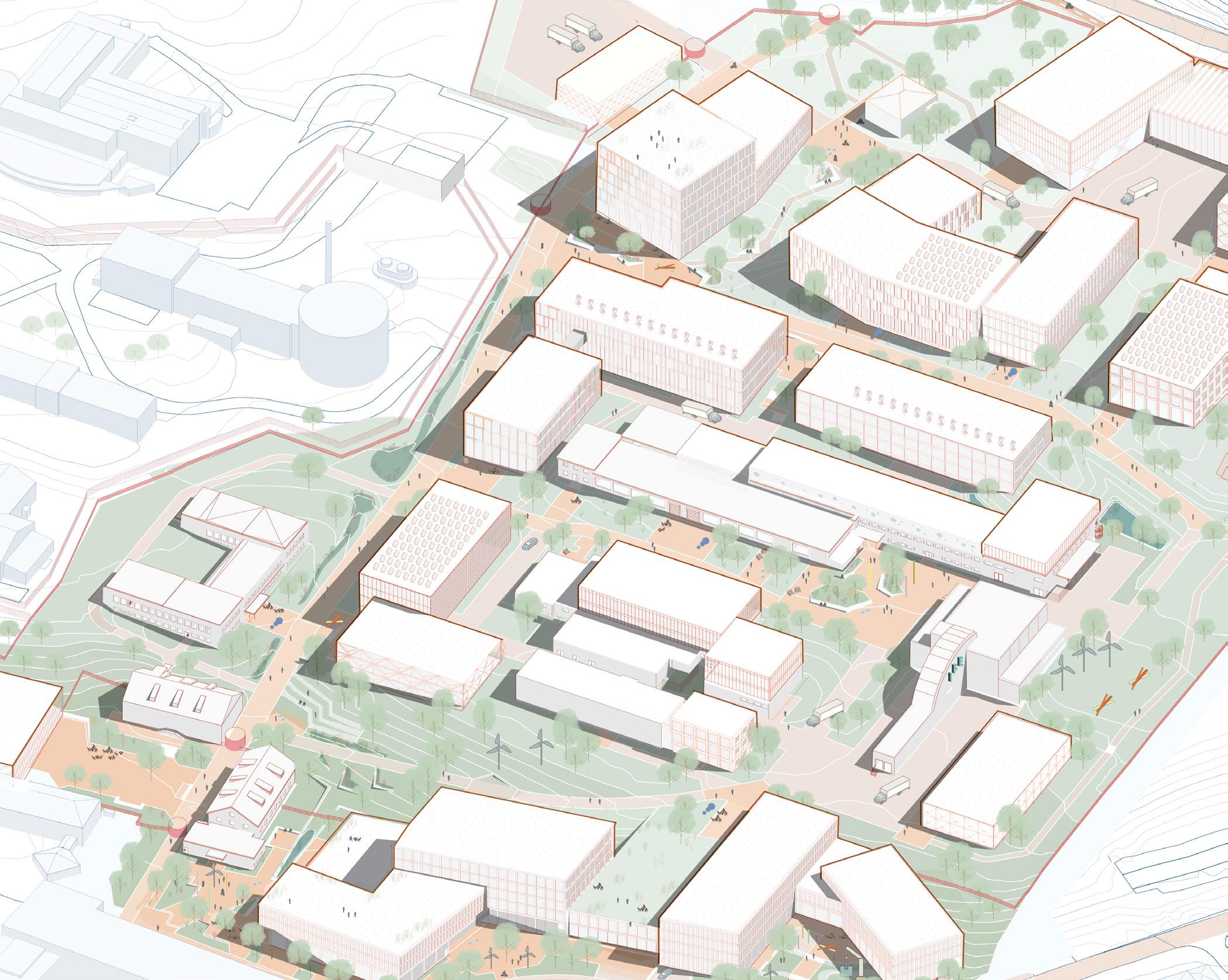 Forslaget viser en transformasjon av området fra en åpen, frittliggende bebyggelse - til en bystruktur med god utnyttelse og grønne byrom formet på de gåendes premisser. Samtidig legges det til rette for god og sikker drift