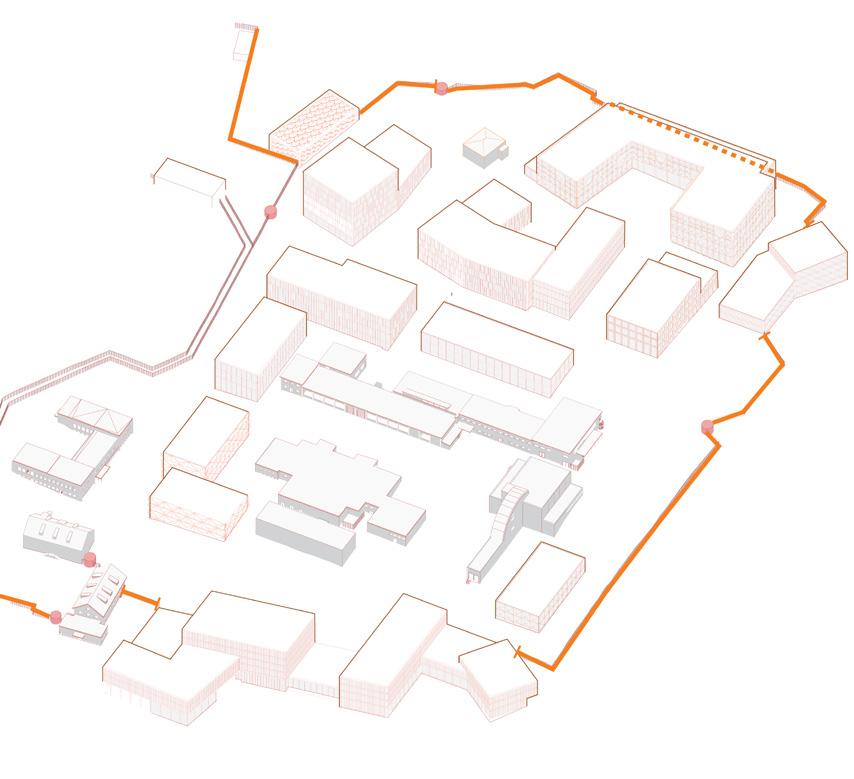 Møter byen med by: I møtet mellom byen og det sikrede området plasseres et multifunksjonsbygg med offentlige, vestvendte byrom.