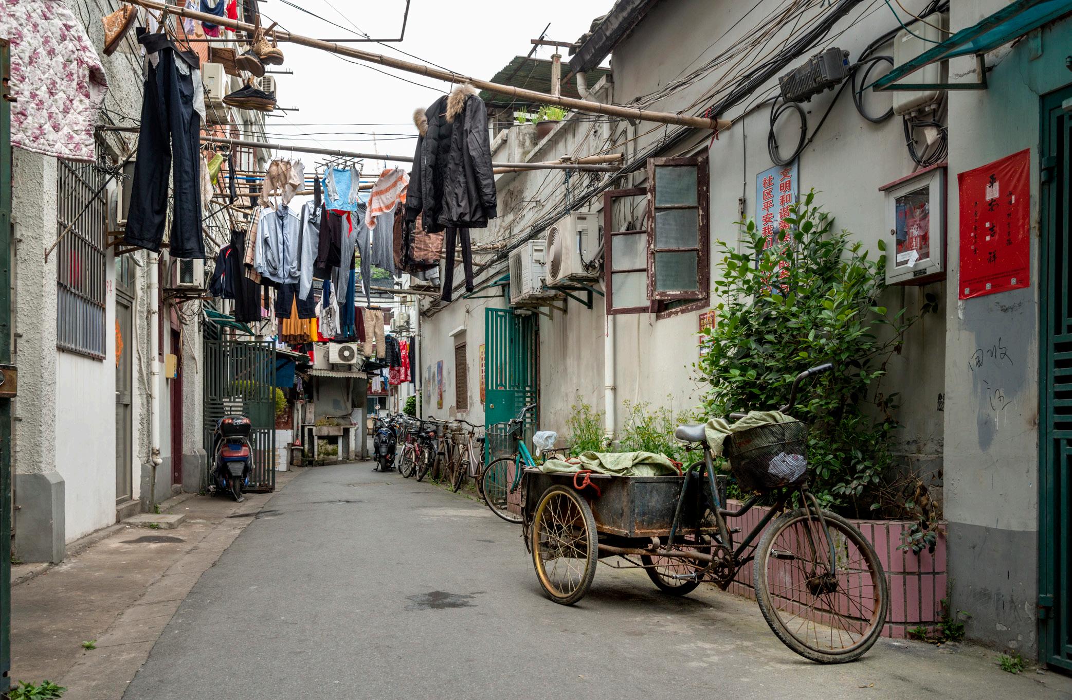 Några tiotals meter från de sprakande affärsgatorna möts man av trånga gränder och dagens kinesiska urbana miljöer med tvätt som hänger på tork mellan husen och den kinesiska vardagen.