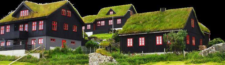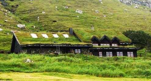 Många hus på Färöarna byggs i samma tradition som husen vikingarna byggde för 1 000 år sedan. Fasader i sten och svart slammat trä och grästak.