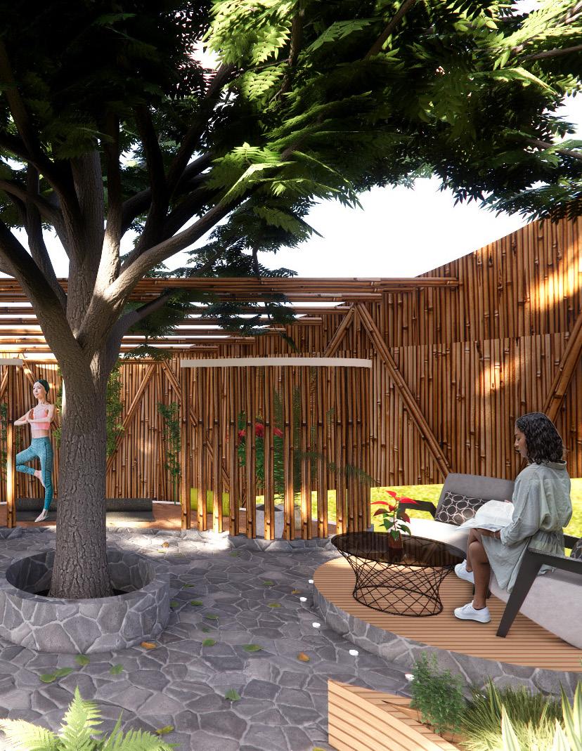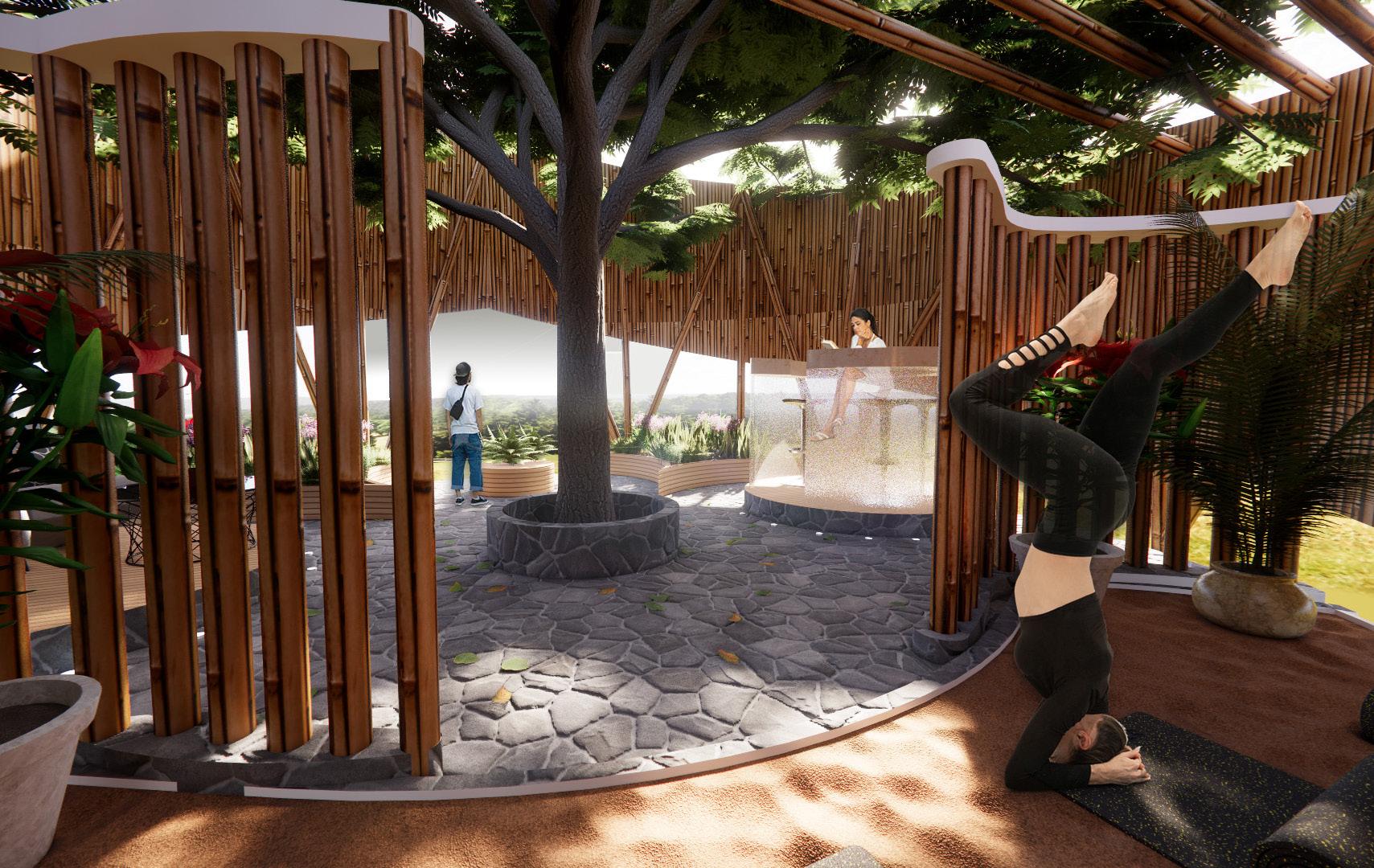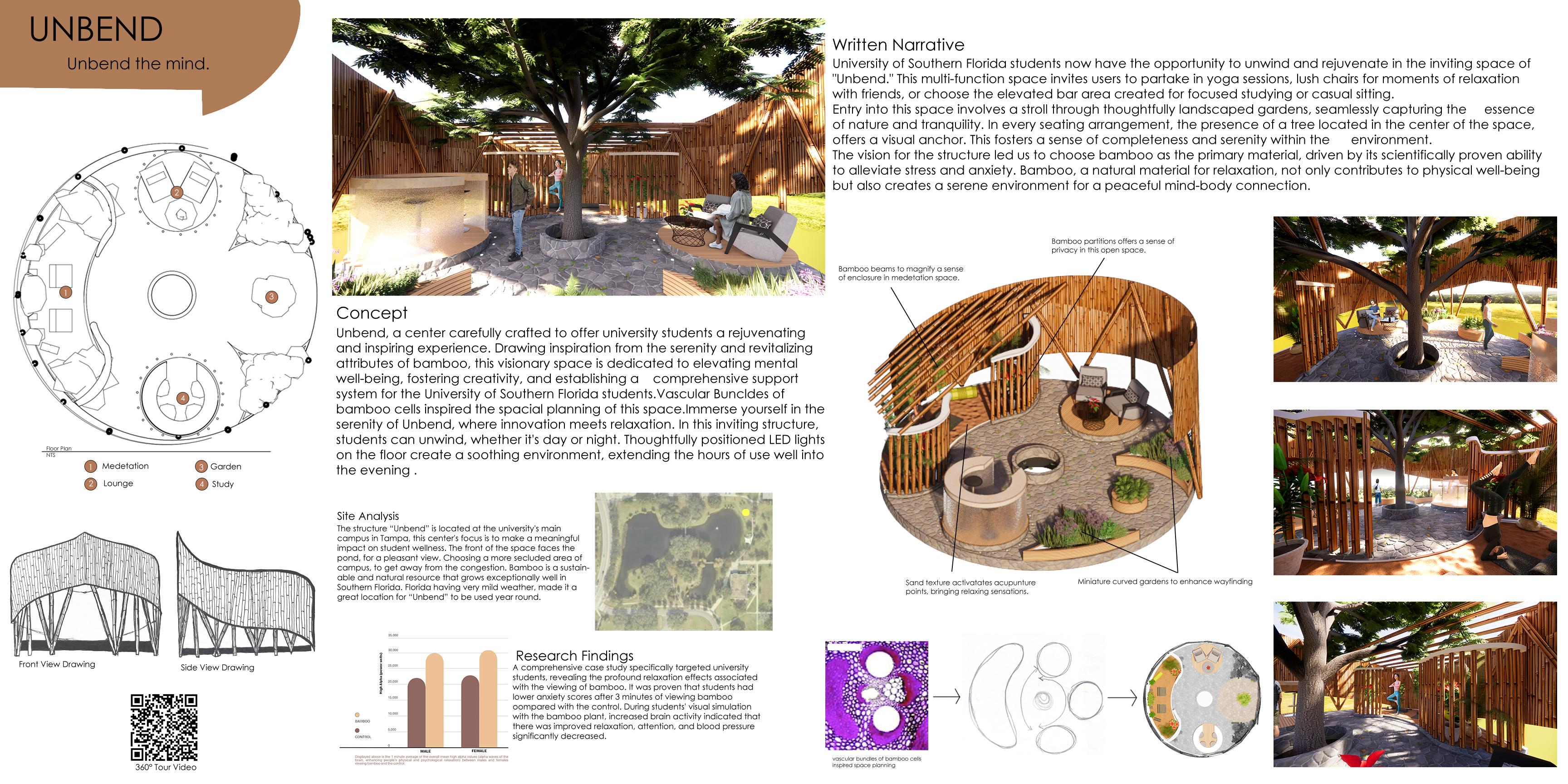 Unbend, a center carefully crafted to offer university students a rejuvenating and inspiring experience. Drawing inspiration from the revitalizing attributes of bamboo, this space is dedicated to elevating mental well-being, fostering creativity, and establishing a comprehensive support system for the University of Southern Florida students. Vascular Bundles of bamboo cells inspired the spacial planning of this space, each “cell” having a different function. Immerse yourself in the serenity of Unbend. In this inviting structure, students can unwind, whether it’s day or night.