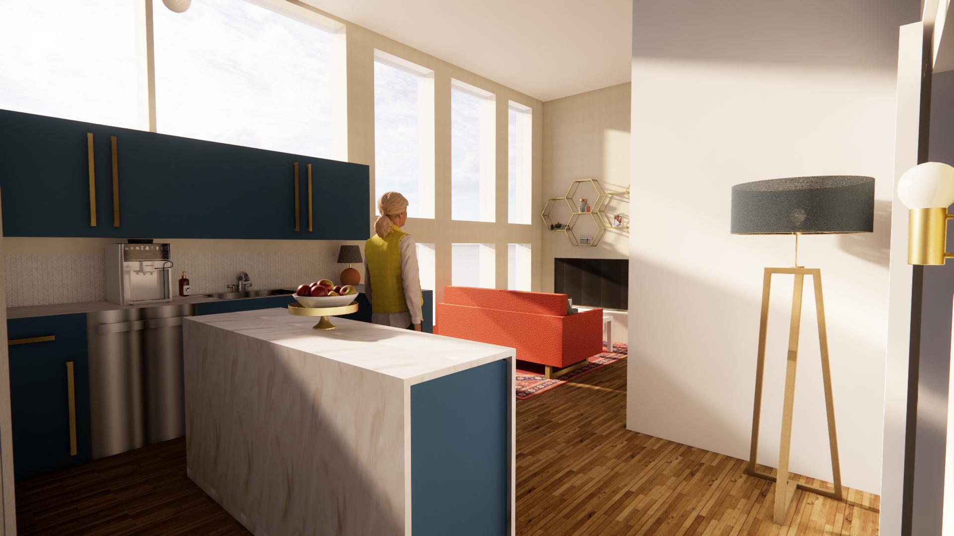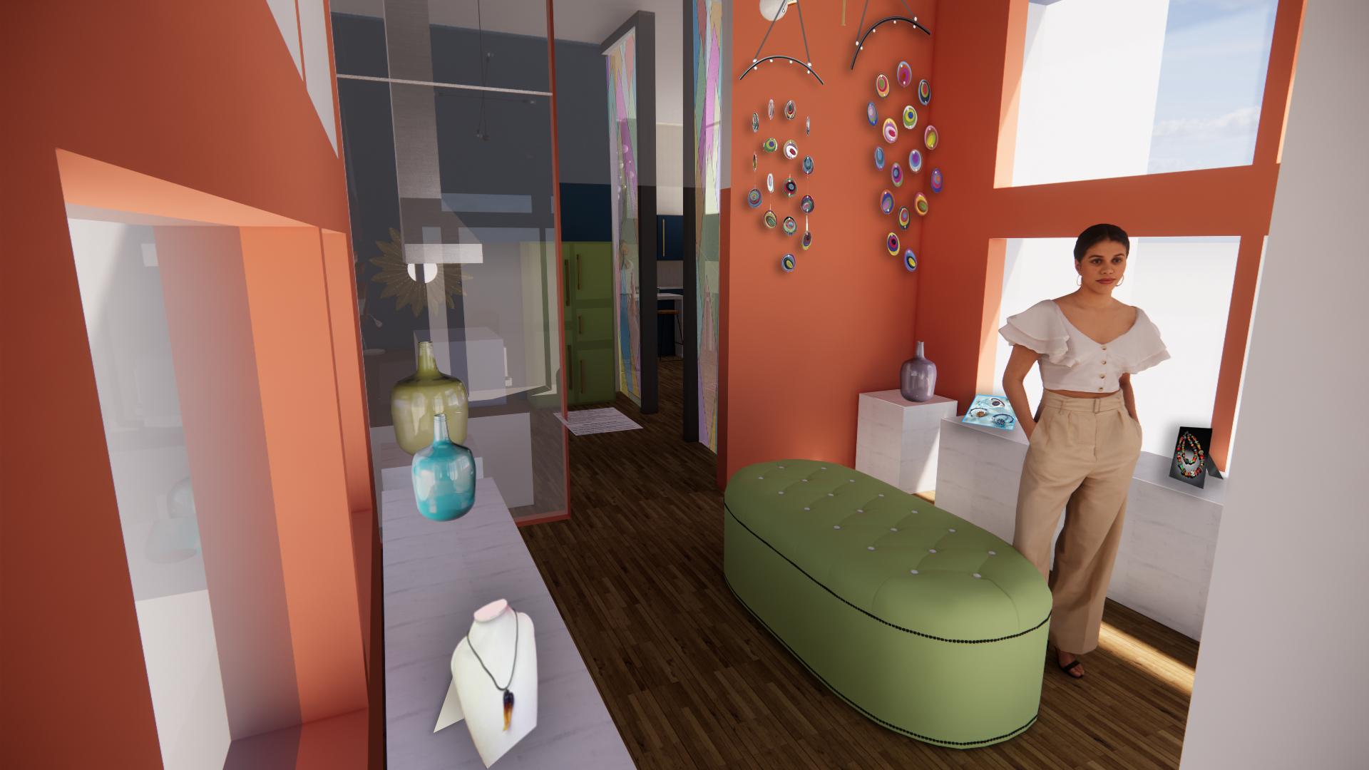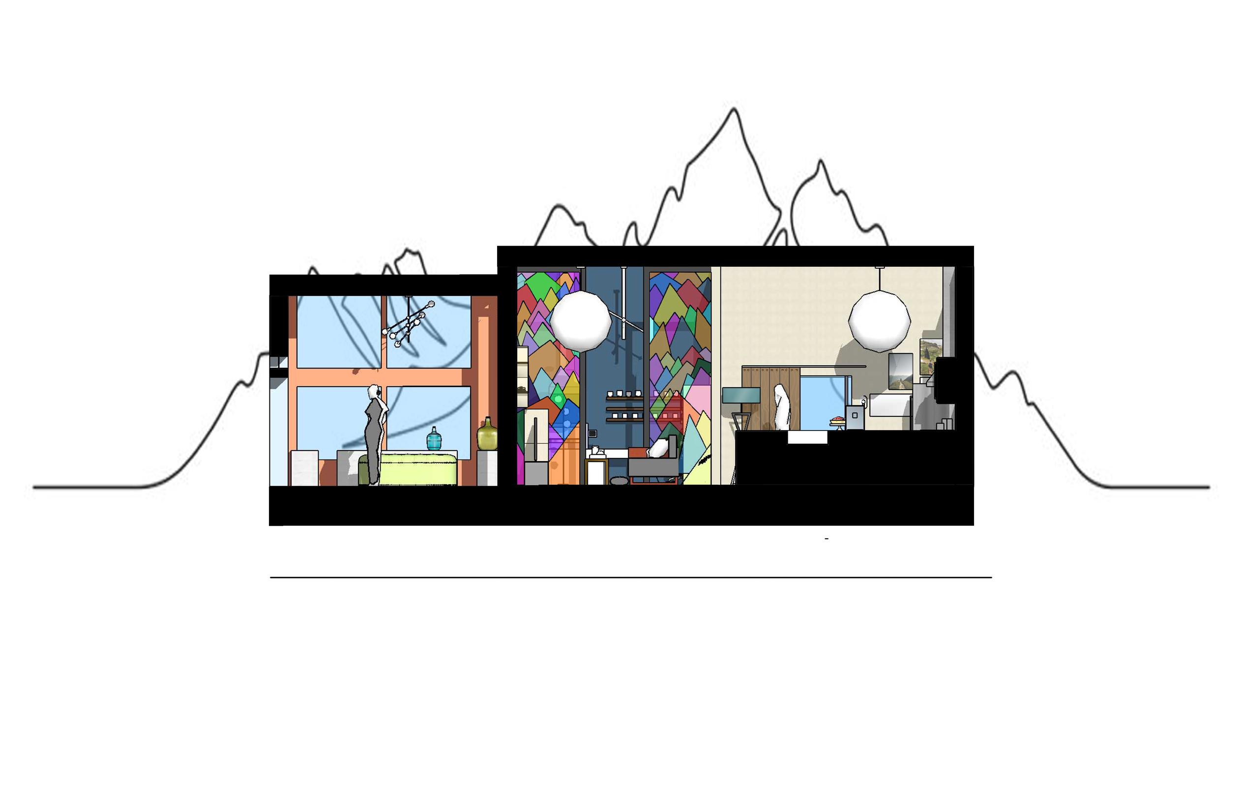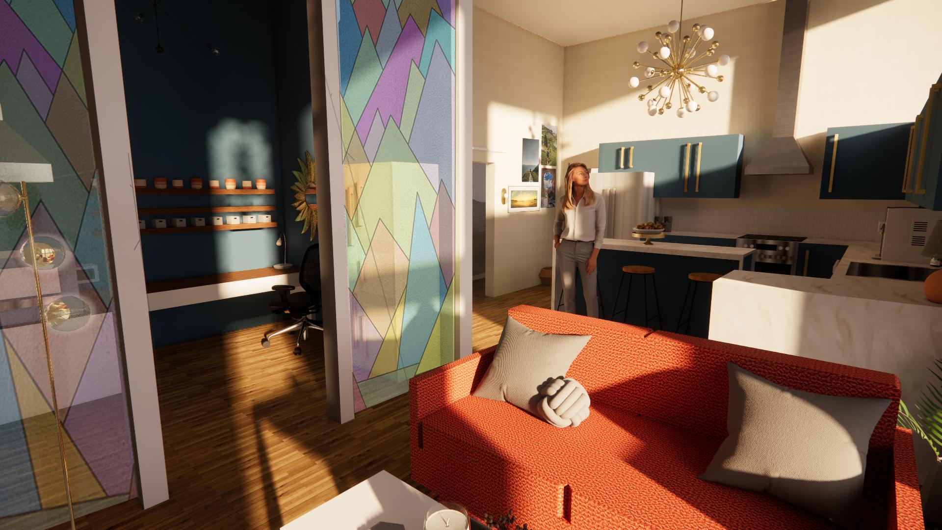 The client wanted an open concept while also having some privacy in her living area and total privacy in her bedroom and bathroom. The exhibit leads into the studio space with a t ransparent wall so guests can see into her work space. From the studio you travel into the living room/ kitchen. There is a divider wall that is made out of stained glass, nodding to her work with glass, and love for the mountains. It is somewhat open but also closed to give her a sense of privacy. Next, in the back of the house is her bedroom and bathroom which has total privacy. When entering the house, you enter in through the exhibit space which has a lower ceiling and once you enter the studio space the ceiling gets higher showing that it is now starting to get more private.