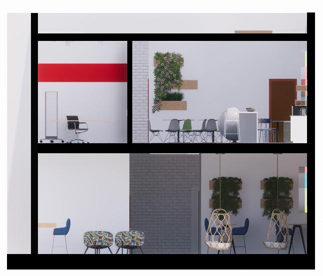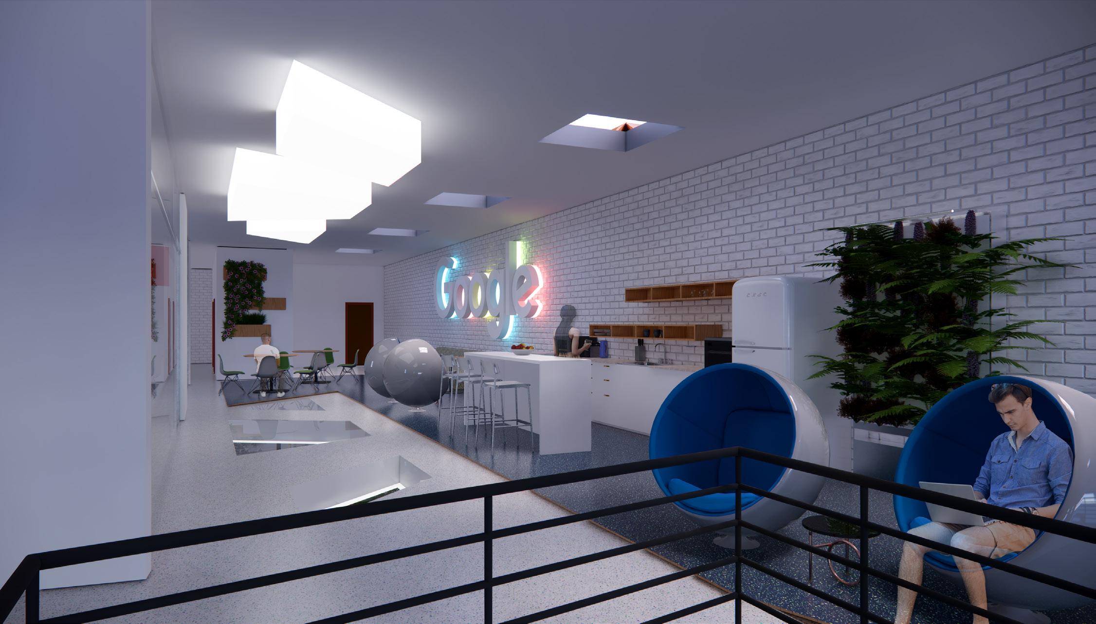 A common design problem seen in co-working spaces post Covid-19 is poor space utilization. Office spaces aren’t being fully utilized as people continue working from home. By making the space more inviting and comfortable, creating “neighborhoods” to mimic personal spaces and interaction places, workers will feel more ownership of space and will be more open to returning to the office. Using angled walls, inspired by the Google logo, to create movement and direction throughout the space.
