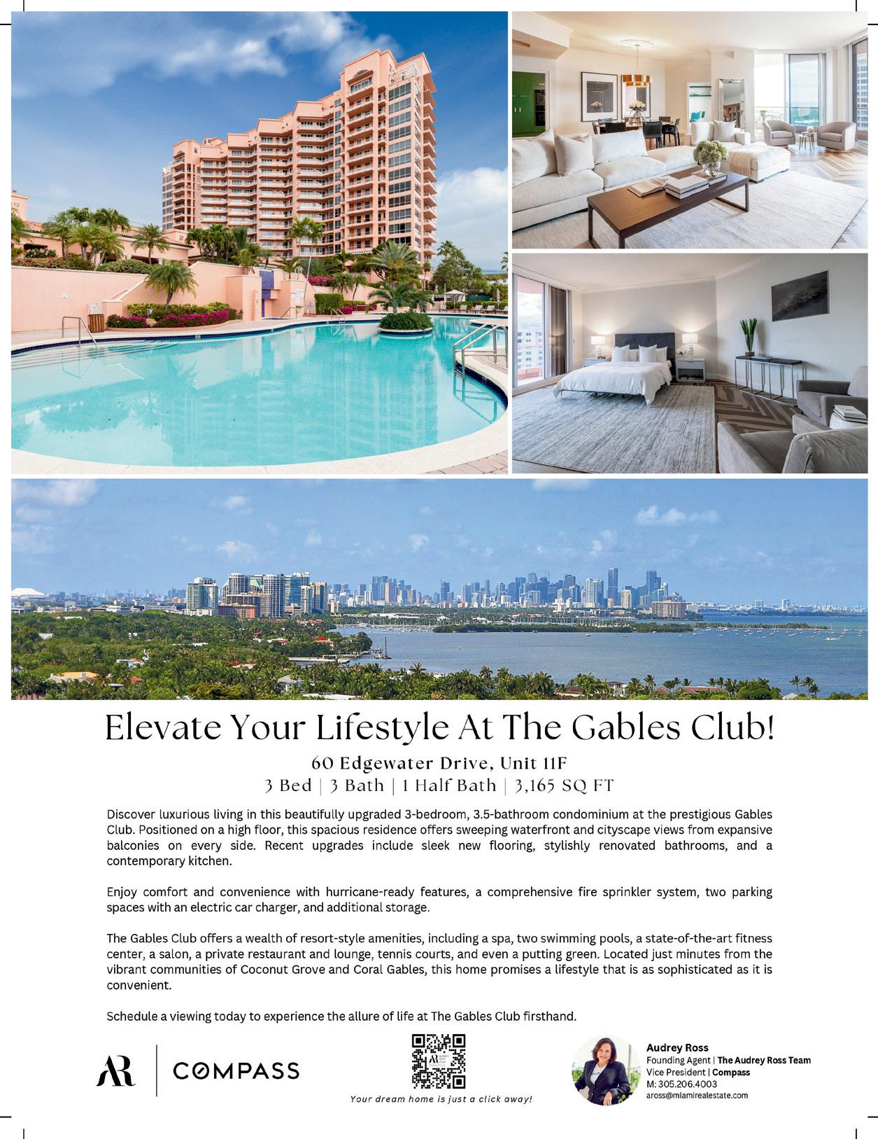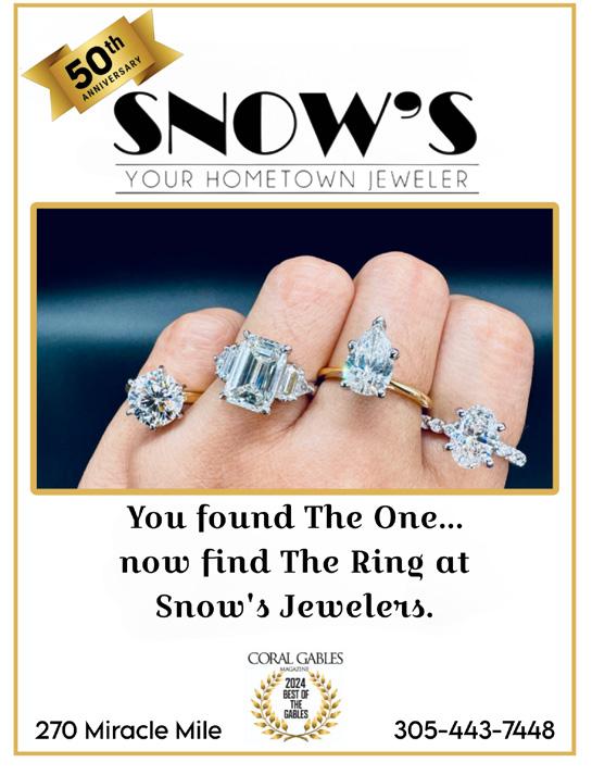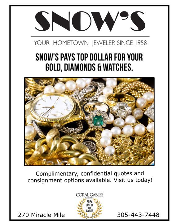 Gables Magazine is published monthly by City Regional Media, 1200 Anastasia Ave. Suite 115, Coral Gables FL 33134. Telephone: (305) 995-0995. Copyright 2024 by City Regional Media. All rights reserved. Reproduction in whole or part of any text, photograph or illustration without prior written permission from the publisher is strictly prohibited. Send address changes to subscriptions@coralgablesmagazine.com. General mailbox email and letters to editor@ coralgablesmagazine.com.