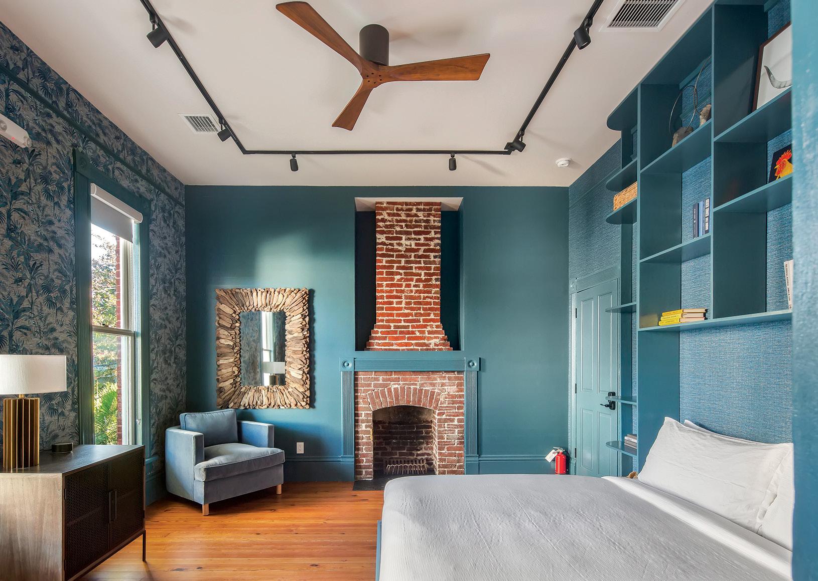 ABOVE: THE “BLUE ROOM” BEDROOM SUITE AT THE GRAND MALONEY HAS RETAINED A HISTORIC CHARM WITH A BRICK FIREPLACE AND BOOKSHELVES.