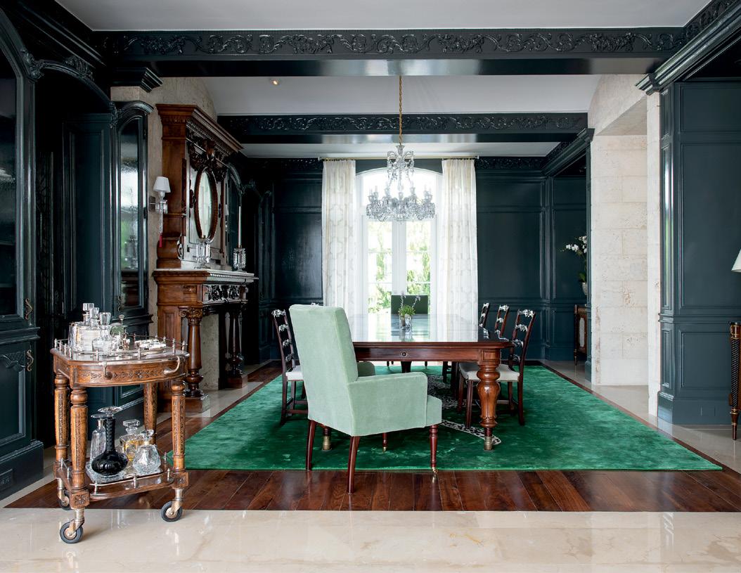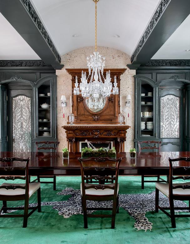 While many interior designers are doing away with formal dining rooms as of late, the dining room in this home is an immediate focal point. It features remarkable design details such as an opulent crystal chandelier, a gilded mirror and antique console, and a striking emerald green area rug designed by Diane von Furstenberg for The Rug Company. Although such tony design elements could come off as stuffy, this room is anything but, as it’s frequently used for entertaining and lounging, and exudes major coziness, particularly when a fire is lit in the French chateau-inspired fireplace, an original feature of the home.