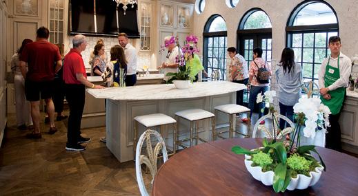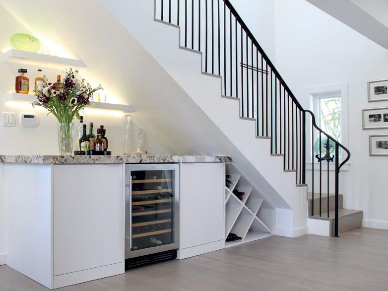What Capiro created was a storage cabinet area (behind the white panels), a temp-controlled mini wine vault and a built in wine rack. She used a single slab of marble to surface the area, accenting the wall with two back-lit shelves for liquor bottles. “I decided not to do a wet bar, because the kitchen was in such close proximity. The marble top just created surface space, and it’s good to have that space to put things.” ■