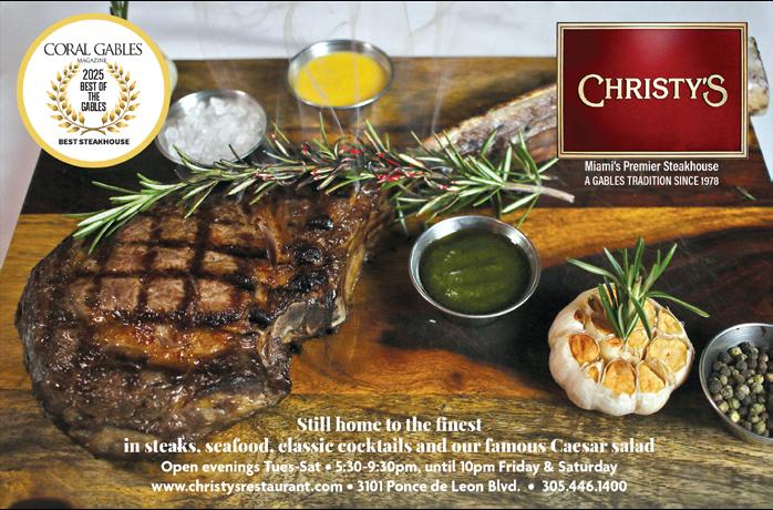 Morton’s The Steakhouse Morton’s in the Gables is not just another Morton’s. Its setting in the Colonnades gives it a unique elegance, with outdoor seating under the arches. Dependable quality, prime-aged beef, excellent salads, and warm fresh loaves of bread for the table. Good place to take that important client. Great bar food with filet mignon sandwiches or short rib tacos. 2333 Ponce de Leon Blvd. 305.442.1662 $$$