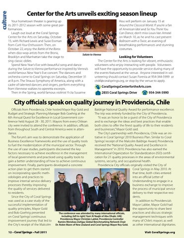 City officials speak on quality journey in Providencia, Chile Officials from Providencia, Chile hosted Mayor Roy Gold and Baldrige National Quality Award for performance excellence. Budget and Strategic Planning Manager Bob Goehrig at the The trip was entirely funded by the City of Providencia. 6th Annual Quest for Excellence in Local Government con“It was an honor to be a guest of the City of Providencia ference held August 28 - 30, 2011. Mayors from every Chilean and to exchange the ideas and best practices that enable city were invited to attend the conference. In addition, officials both cities to offer the finest quality of life to their residents from throughout South and Central America were in attenand businesses,” Mayor Gold said. dance. The City’s partnership with Providencia, Chile was an iniThe forum’s aim was to demonstrate the application of tiative in Coral Springs’ 2010 Business Plan. Similar to Coral Business Excellence Frameworks and the use of quality tools Springs’ receipt of the Malcolm Baldrige Award, Providencia to fuel the modernization of the municipal sector. Through received the “National Quality Award and Excellence in the use of case studies, participants discovered the key Management” in 2010. Providencia has also earned the factors necessary to achieve excellence in the management International Organization for Standardization (ISO) certifiof local governments and practiced using quality tools to cation for 21 quality processes in the areas of environmental gain a better understanding of how to achieve continuous systems, security, and occupational health. improvement. Finally, participants developed a concrete Providencia City officials originally visited the City of action plan to get them started Coral Springs in May 2010. At on incorporating specific meththat time, both cities entered odologies and practices to into an official Letter of improve internal service delivery Understanding to engage in a processes thereby improving business exchange to improve the quality of services delivered the process of municipal service to residents. delivery to their respective resiSince the City of Coral Springs dents. was used as a case study of the In addition to Providencia’s successful implementation of Mayor Labbe, Mayor Gold had quality principles, Mayor Gold the opportunity to share best and Bob Goehrig presented practices and discuss strategic The conference was attended by many international officials, including (left to right) Yasir Al Naqbi of Abu Dhabi, UAE; on Coral Springs’ continuous management techniques with Providencia Mayor Christián Labbé; Providencia Controller improvement journey that led to many of Chile’s mayors as well Ramiro Mendoza Zúñiga; Global Benchmarking Network Chair the City’s receipt of the Malcolm Dr. Robin Mann of New Zealand and Coral Springs Mayor Roy Gold. as other international dignitaries. 12 • Coral Springs • Fall 2011