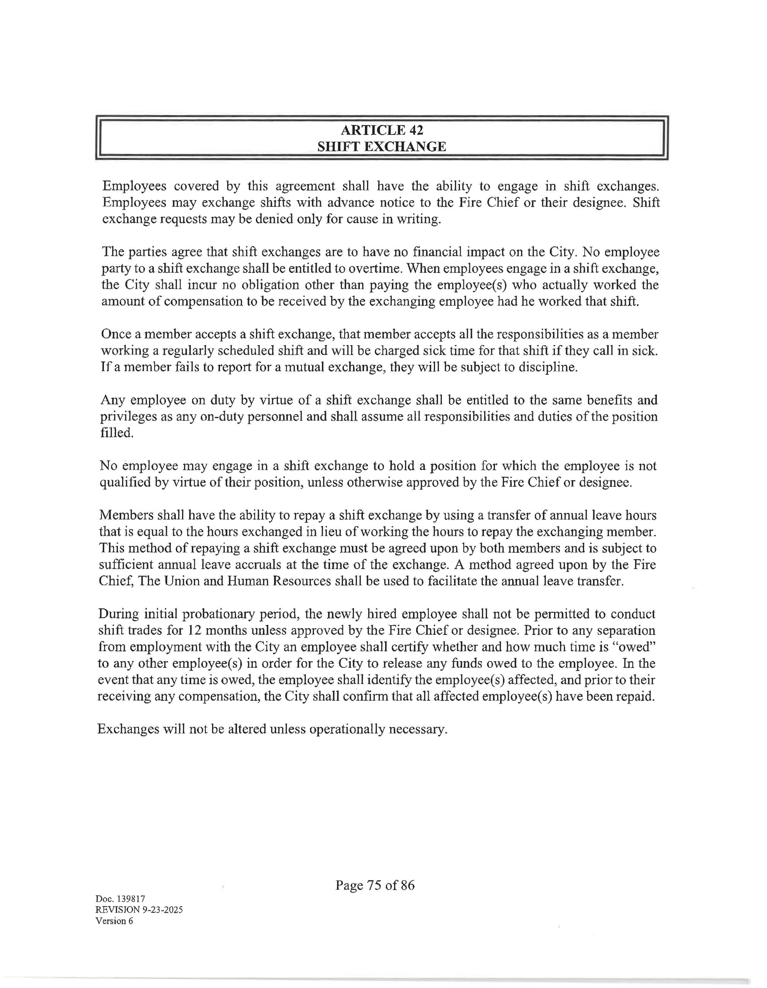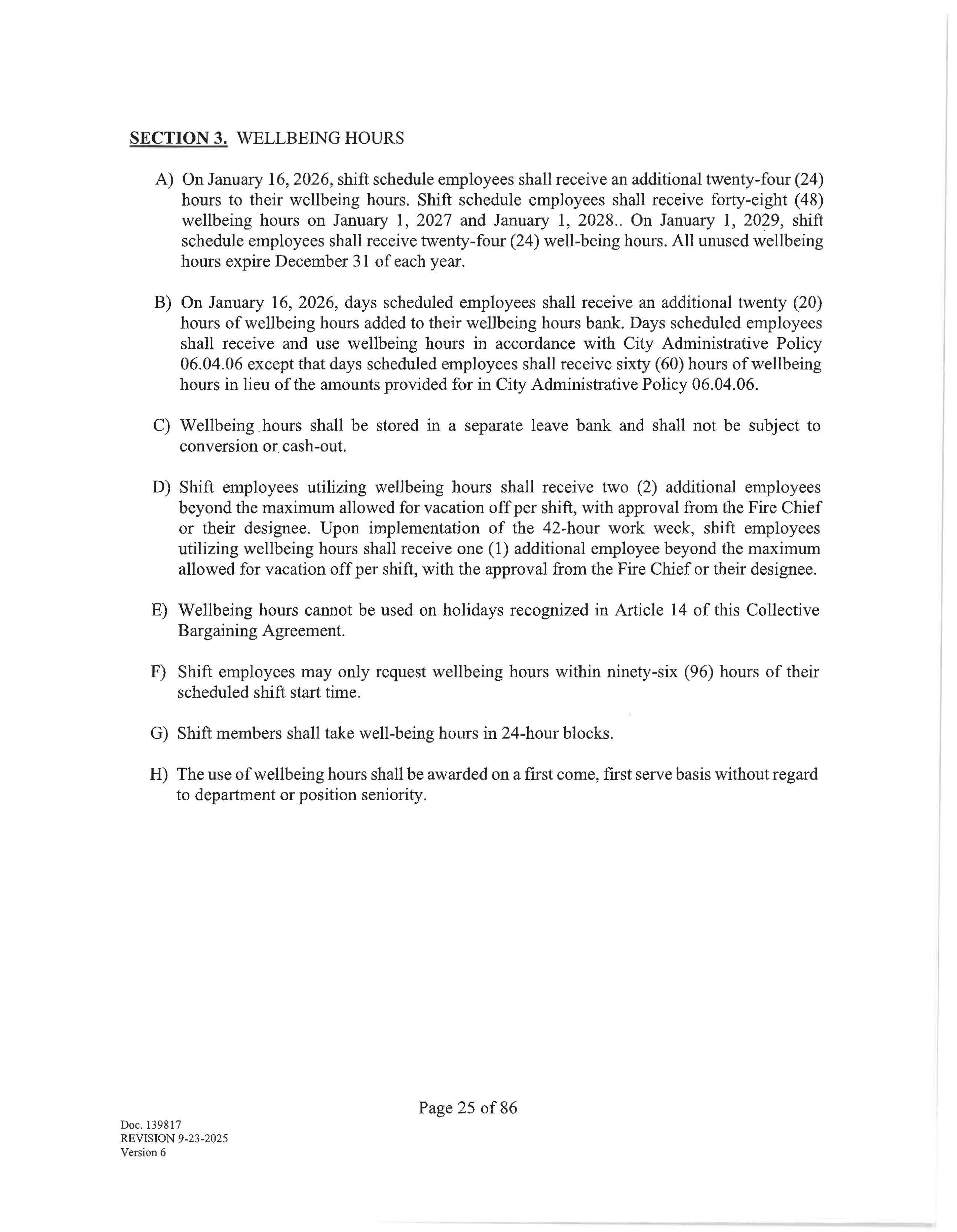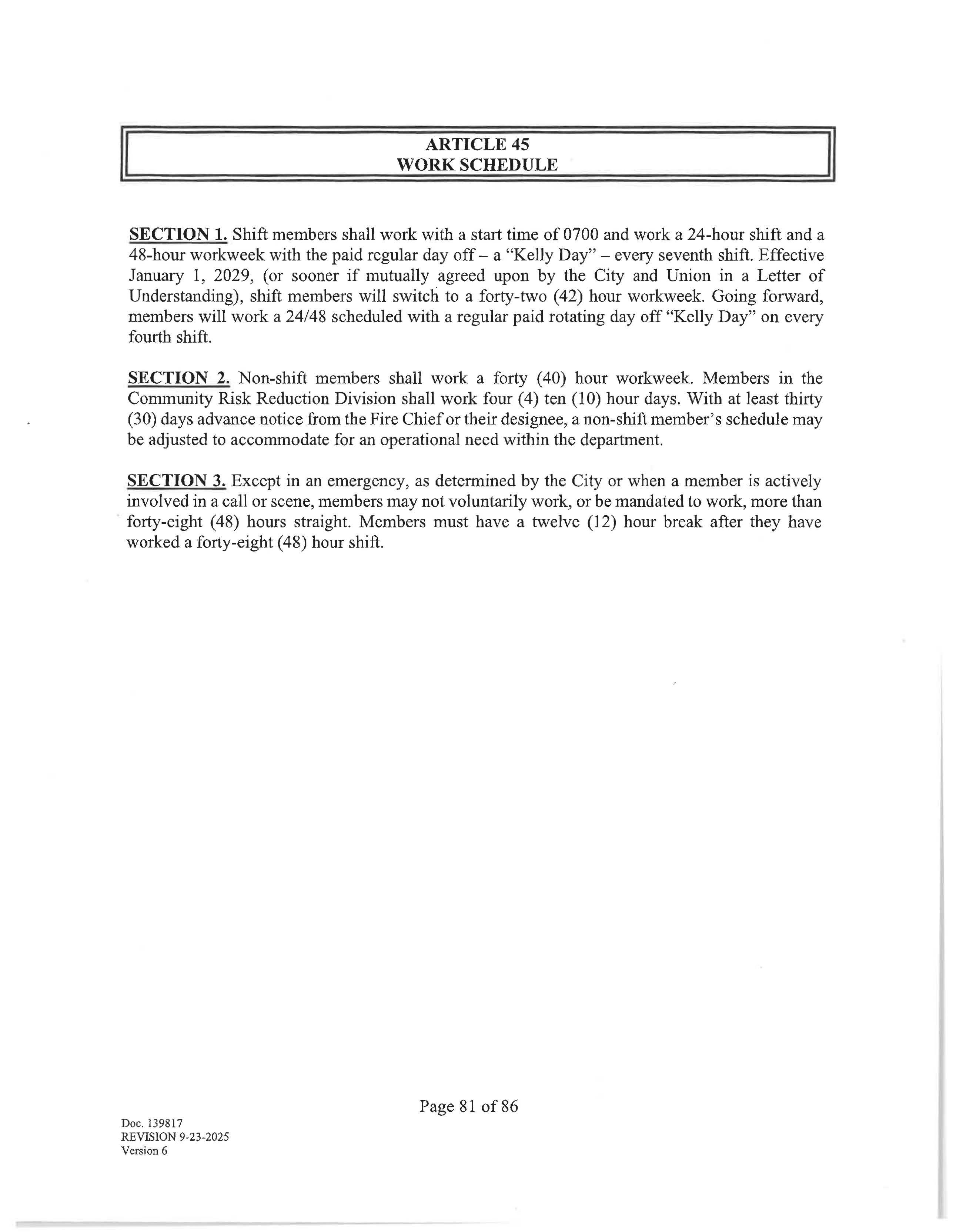 SECTION 1. Shift members shall work with a start time of 0700 and work a 24-hour shift and a 48-hour workweek with the paid regular day off -a "Kelly Day" - every seventh shift. Effective January 1, 2029, (or sooner if mutually agreed upon by the City and Union in a Letter of Understanding), shift members will switch to a forty-two (42) hour workweek. Going forward, members will work a 24/48 scheduled with a regular paid rotating day off "Kelly Day" on every fourth shift.