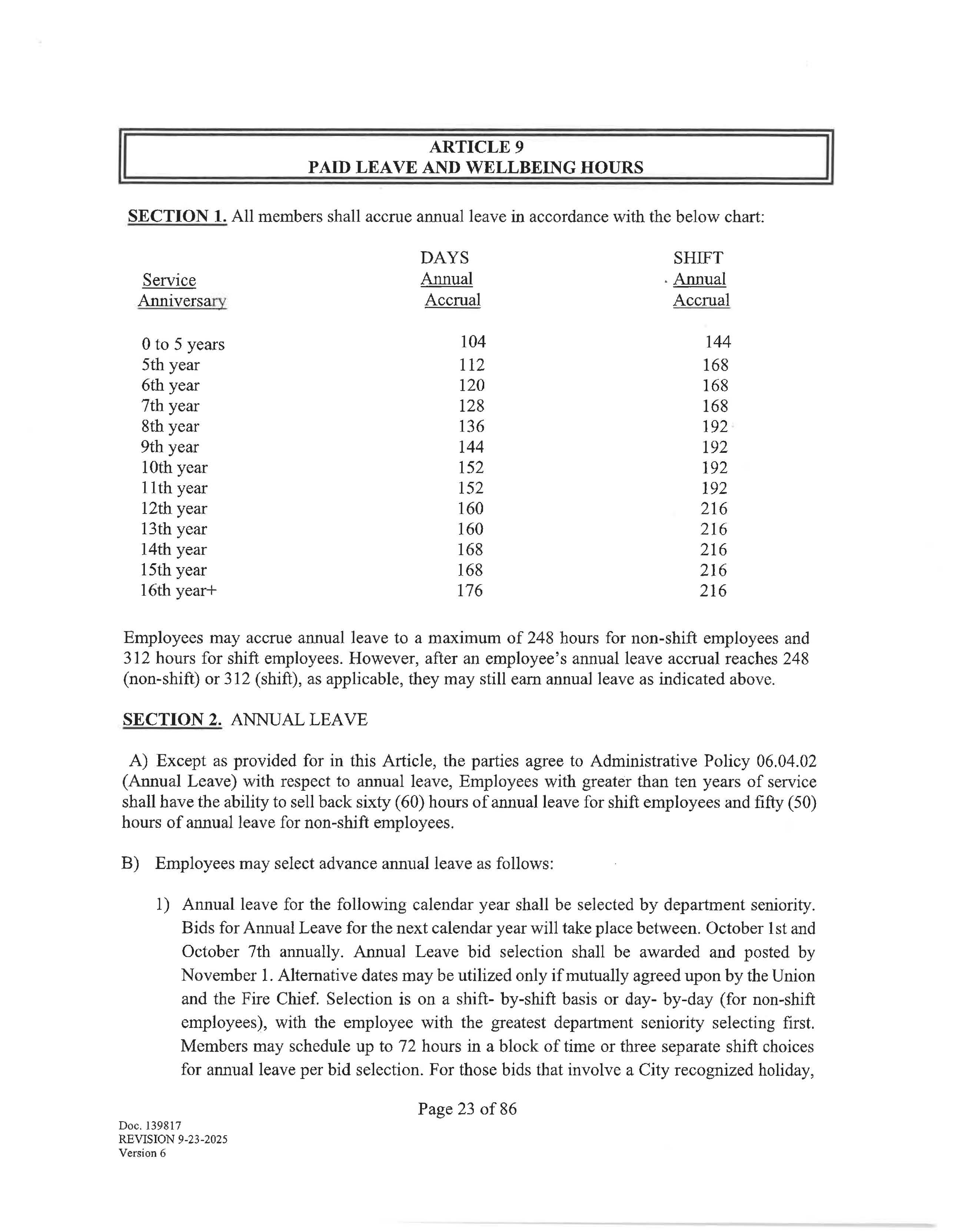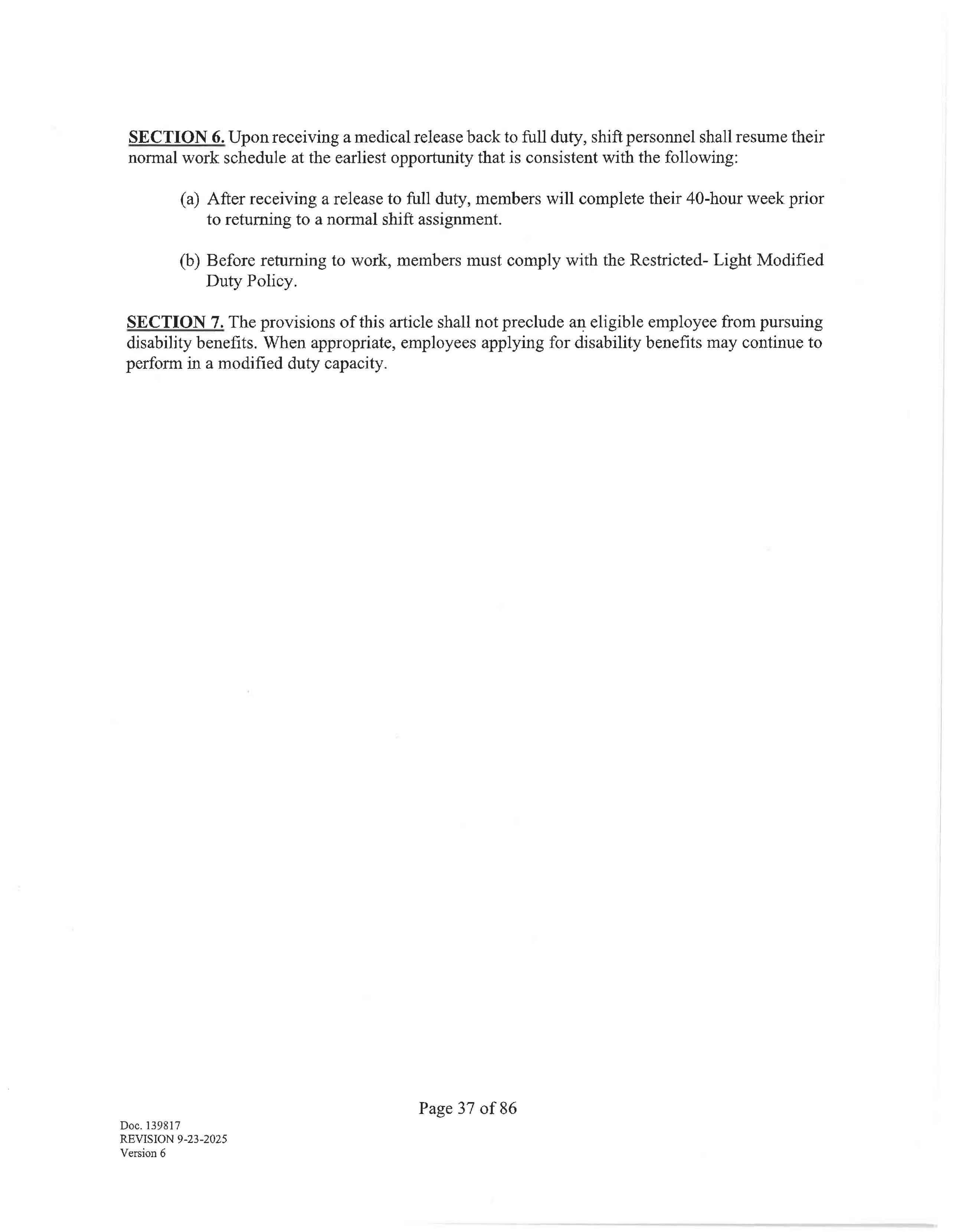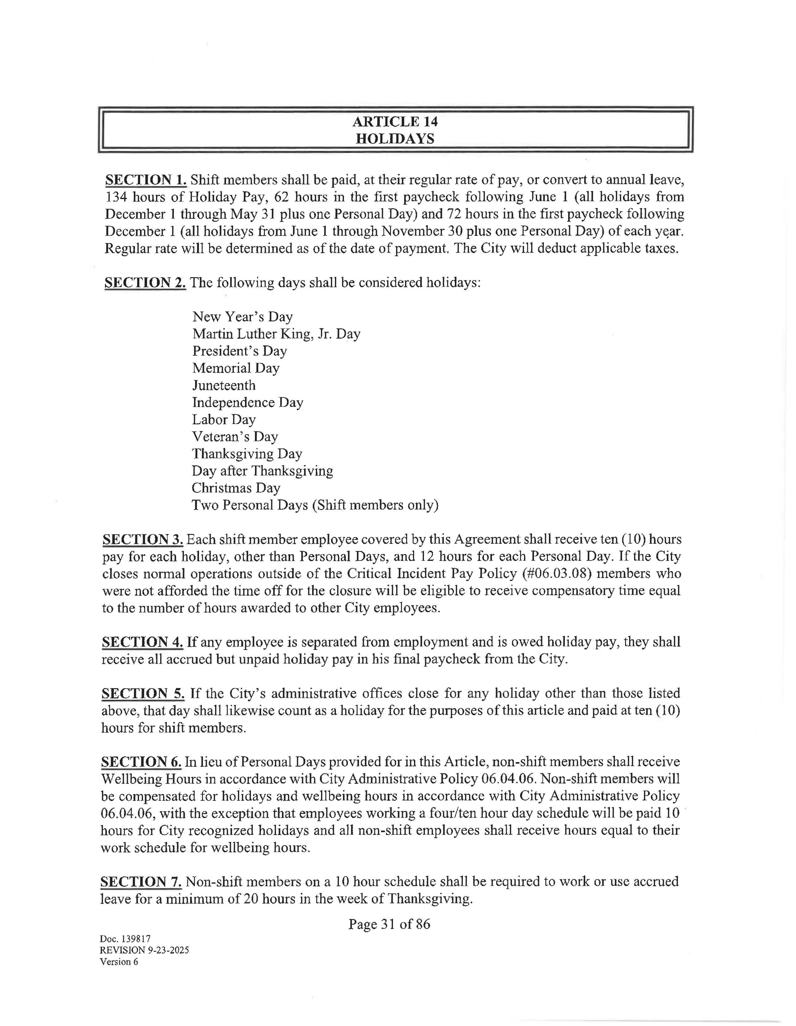 SECTION 1. Shift members shall work with a start time of 0700 and work a 24-hour shift and a 48-hour workweek with the paid regular day off -a "Kelly Day" - every seventh shift. Effective January 1, 2029, (or sooner if mutually agreed upon by the City and Union in a Letter of Understanding), shift members will switch to a forty-two (42) hour workweek. Going forward, members will work a 24/48 scheduled with a regular paid rotating day off "Kelly Day" on every fourth shift.
