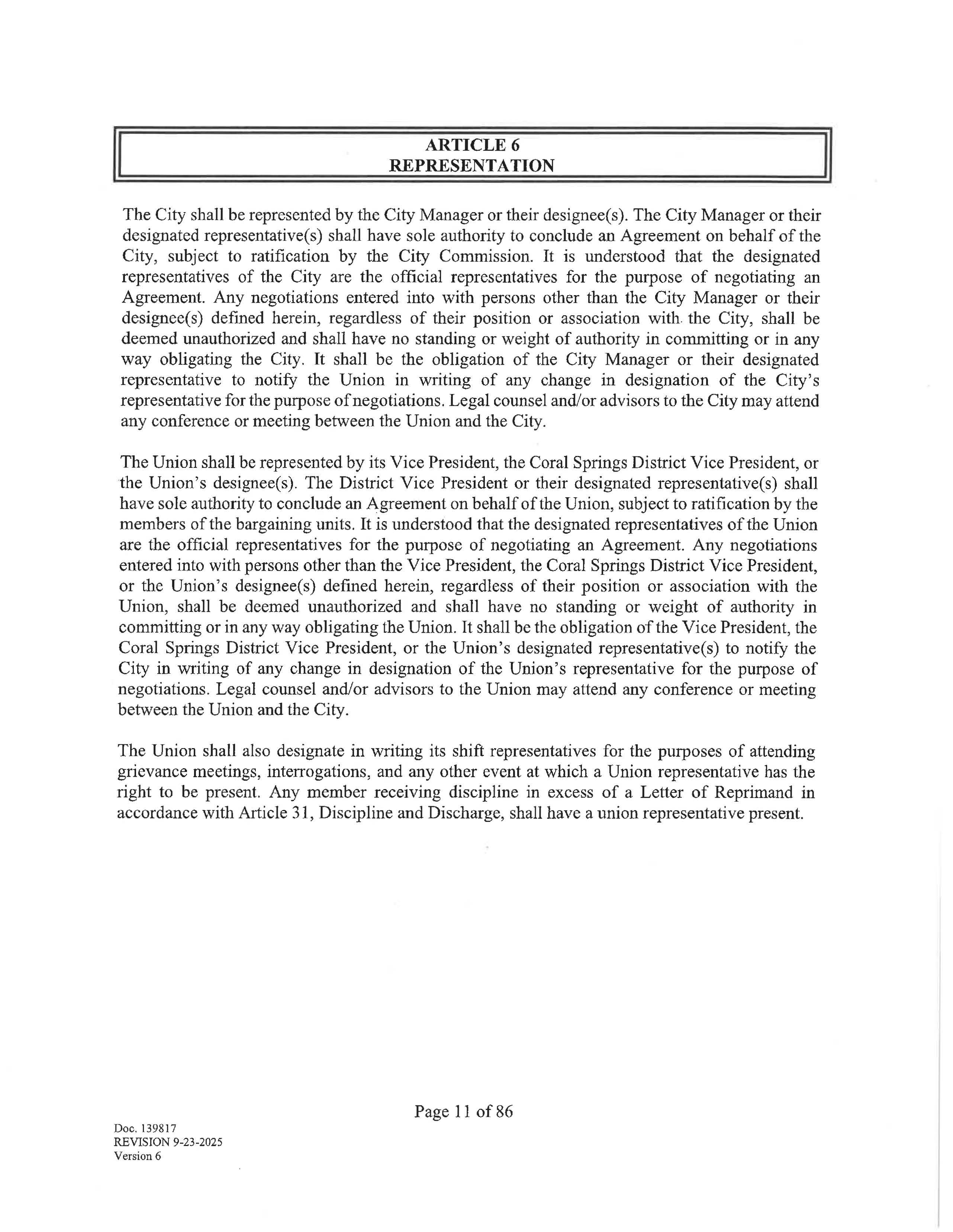 The Union shall be represented by its Vice President, the Coral Springs District Vice President, or the Union's designee(s). The District Vice President or their designated representative(s) shall have sole authority to conclude an Agreement on behalf of the Union, subject to ratification by the members of the bargaining units. It is understood that the designated representatives of the Union are the official representatives for the purpose of negotiating an Agreement. Any negotiations entered into with persons other than the Vice President, the Coral Springs District Vice President, or the Union's designee(s) defined herein, regardless of their position or association with the Union, shall be deemed unauthorized and shall have no standing or weight of authority in committing or in any way obligating the Union. It shall be the obligation of the Vice President, the Coral Springs District Vice President, or the Union's designated representative(s) to notify the City in writing of any change in designation of the Union's representative for the purpose of negotiations. Legal counsel and/or advisors to the Union may attend any conference or meeting between the Union and the City.