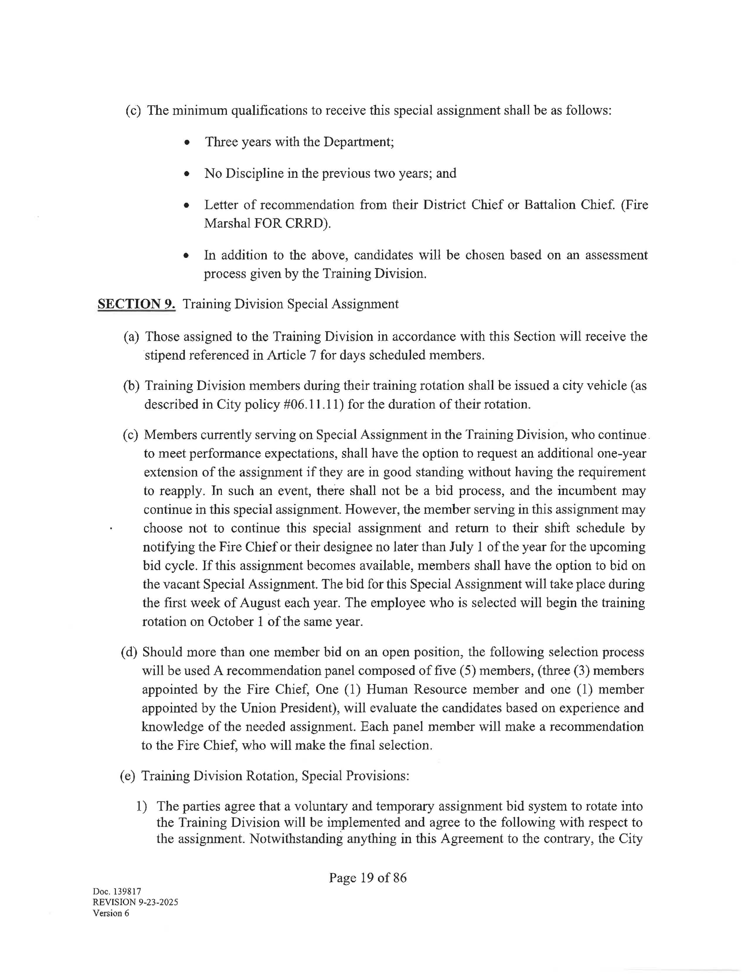 The Fire Chief may deviate from following position seniority during the bid process due to factors such as employee's special certification, experience, or special assignment.