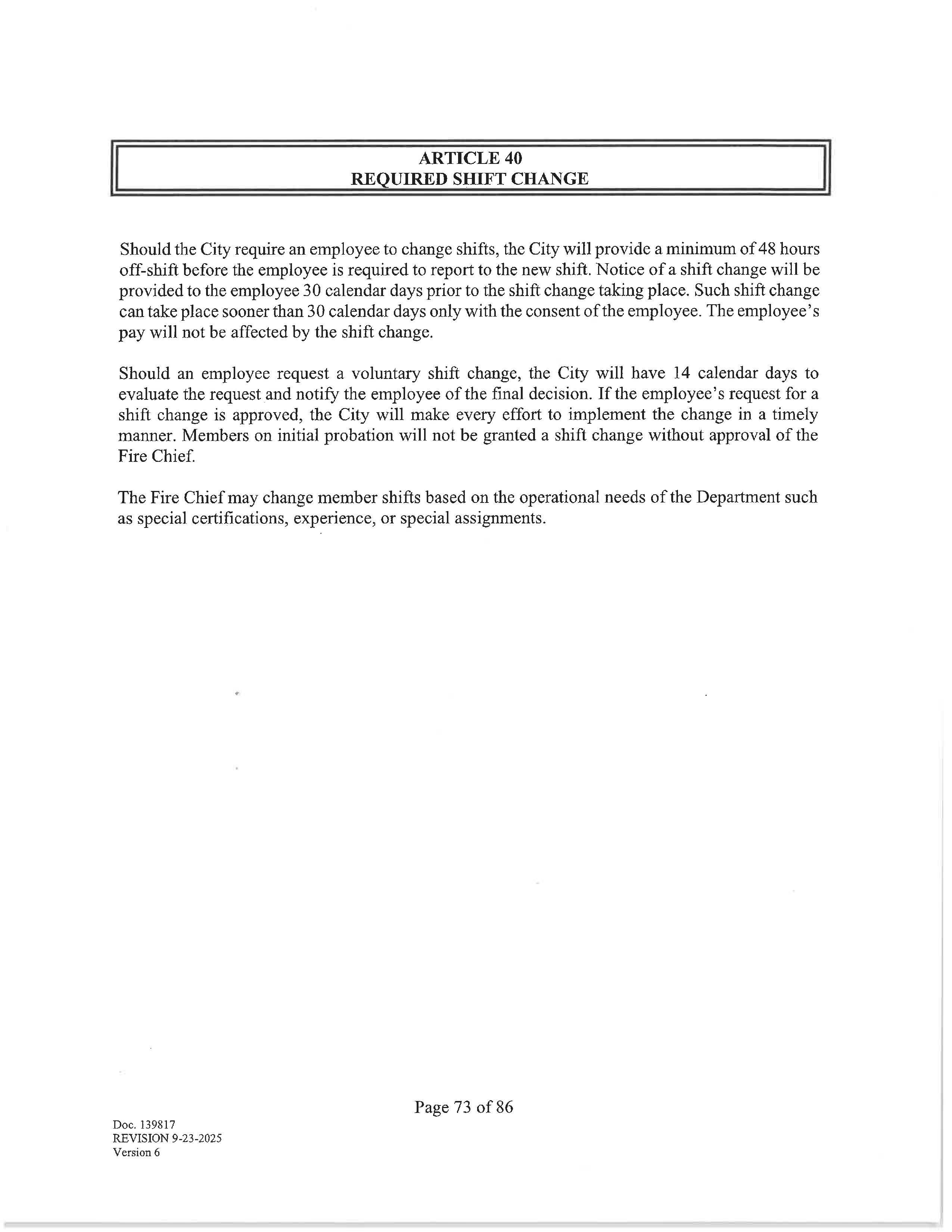 Station assignments may be changed due to operational needs. In the case that a station assignment is permanently changed the City will give the employee a three-shift notice.