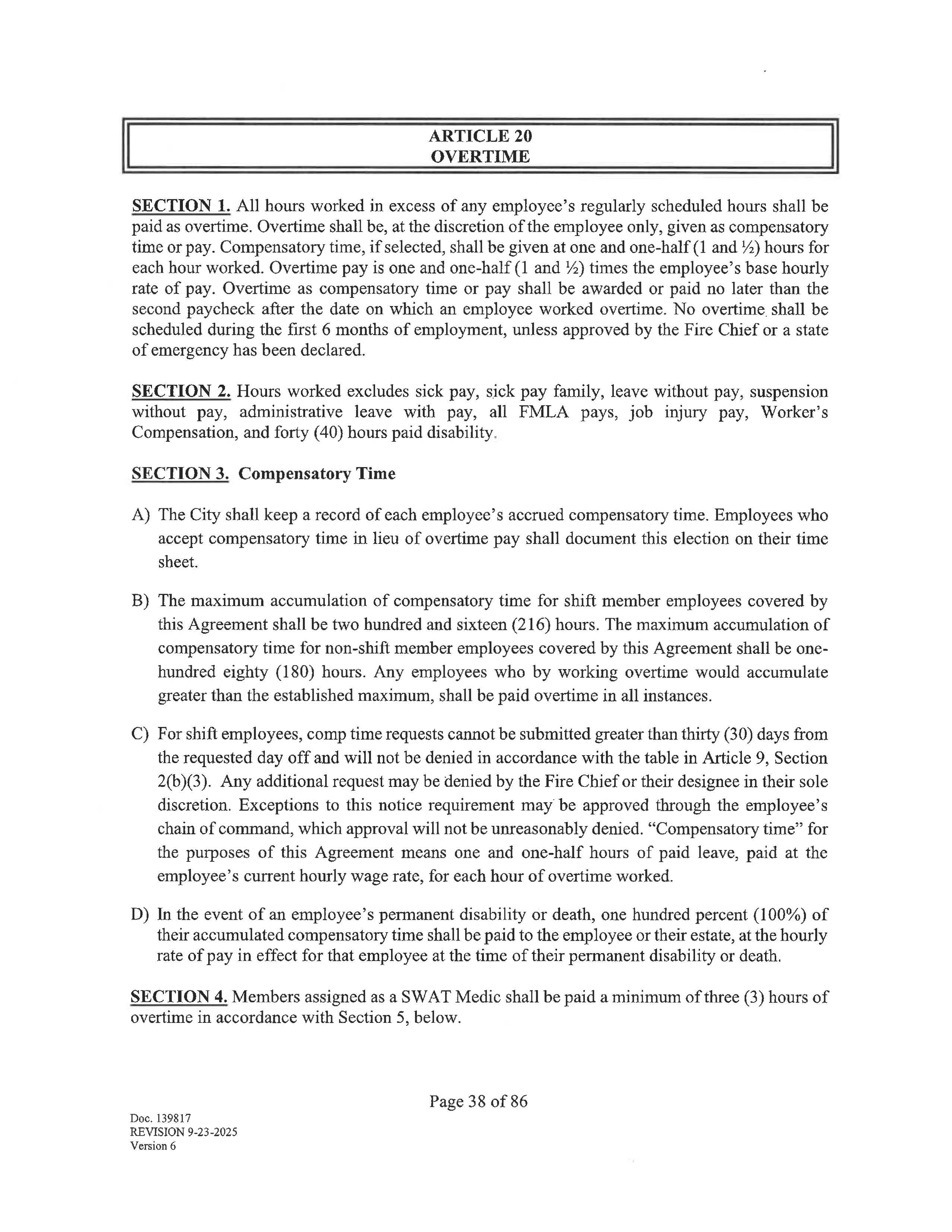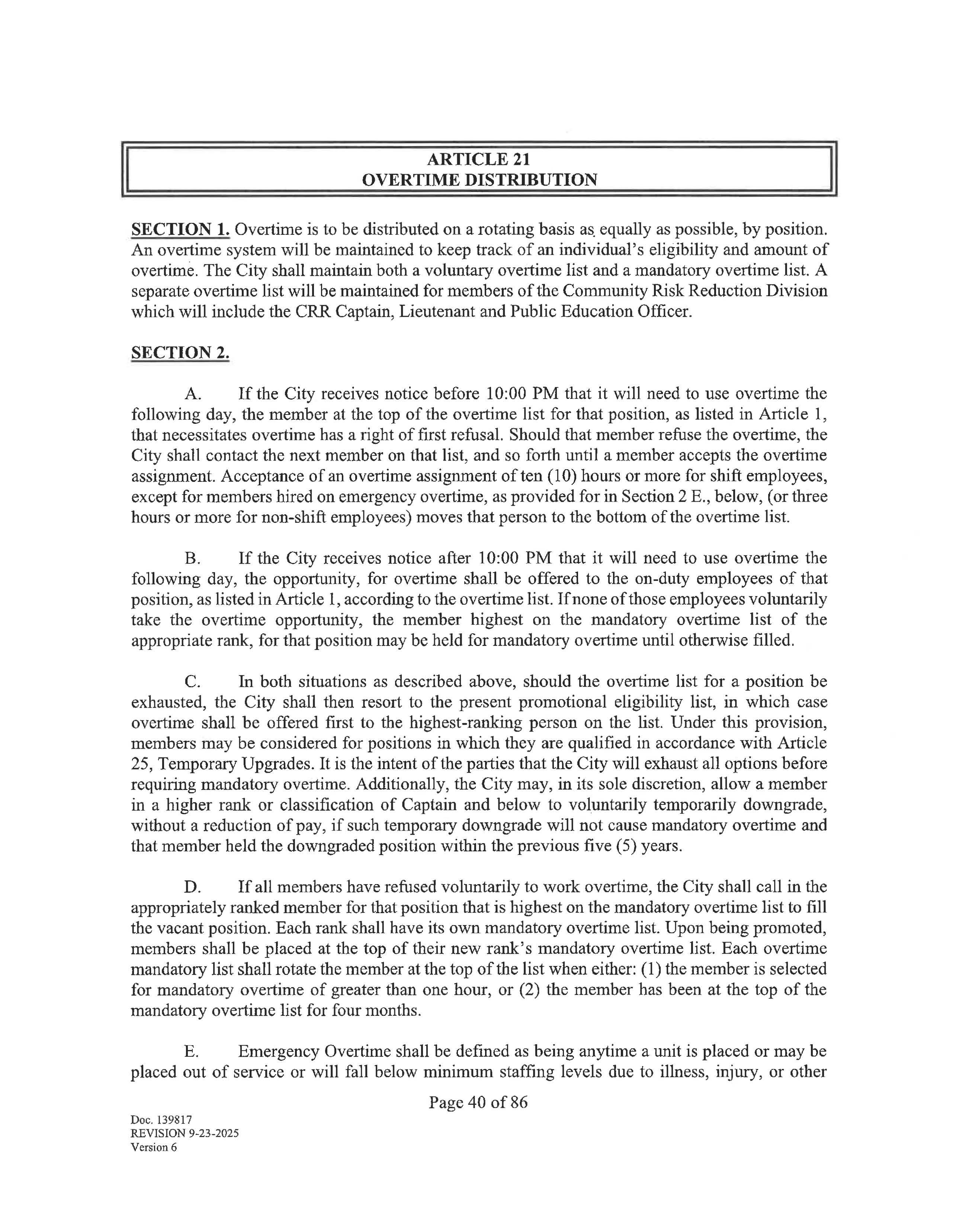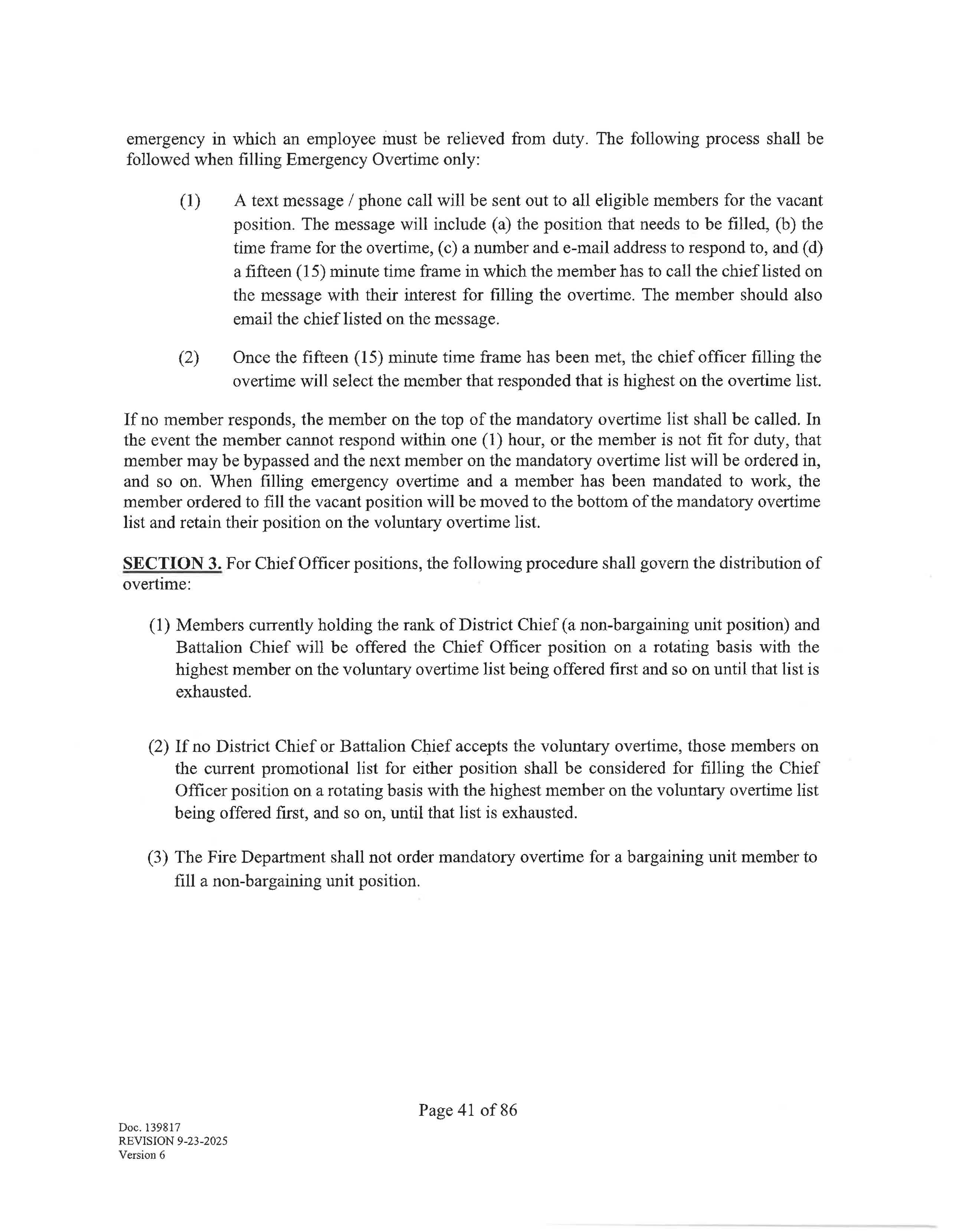 SECTION 3. Except in an emergency, as determined by the City or when a member is actively involved in a call or scene, members may not voluntarily work, or be mandated to work, more than · forty-eight (48) hours straight. Members must have a twelve (12) hour break after they have worked a forty-eight (48) hour shift.