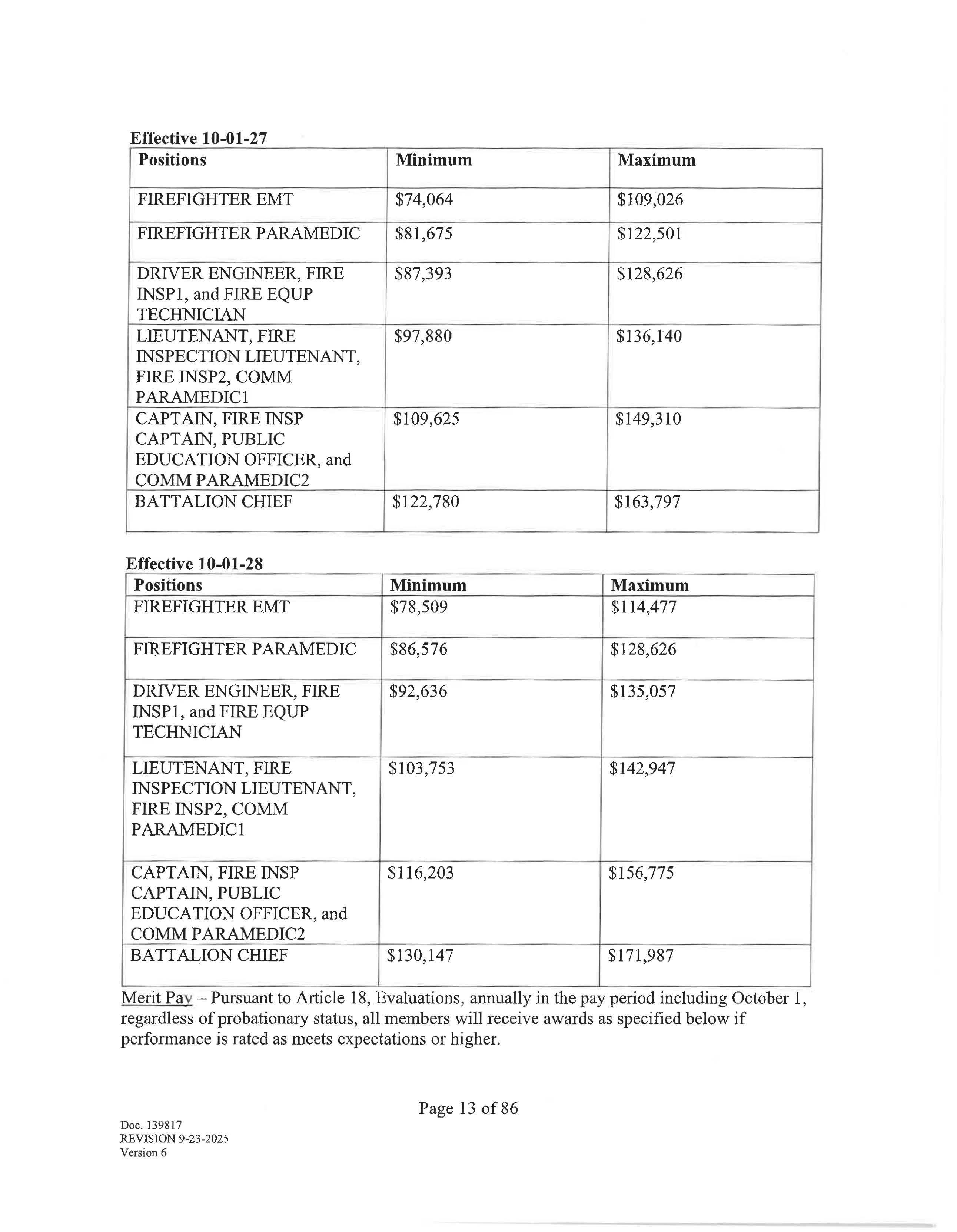 The pay ranges will be adjusted annually as detailed below: