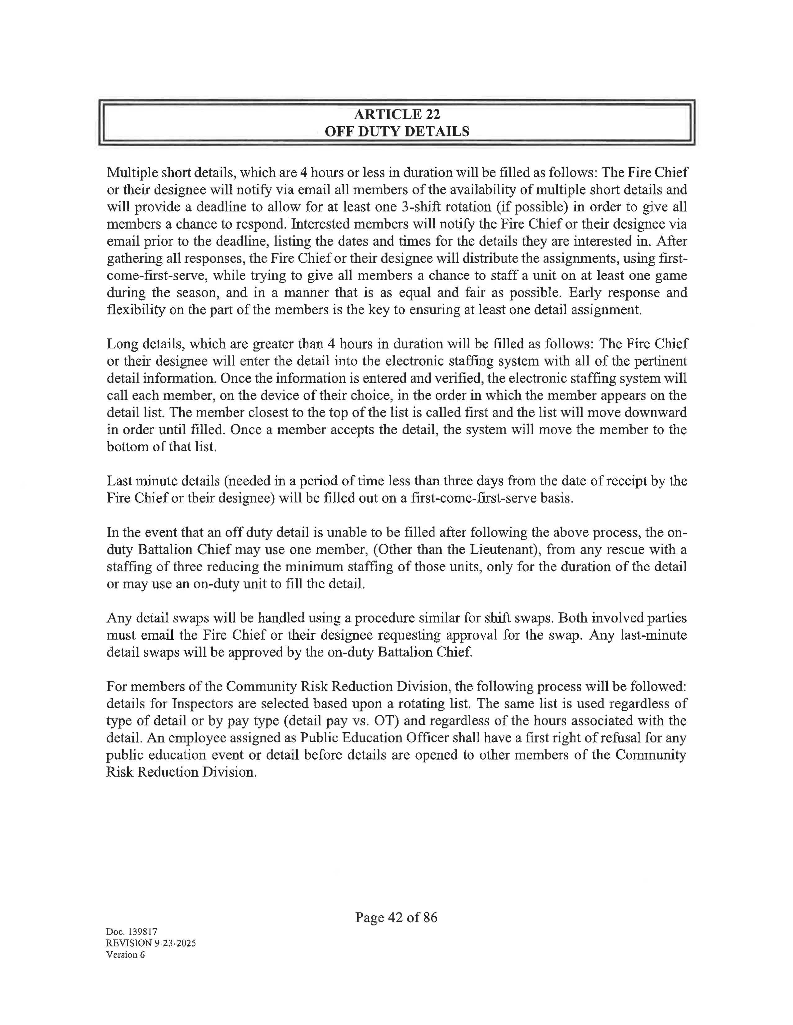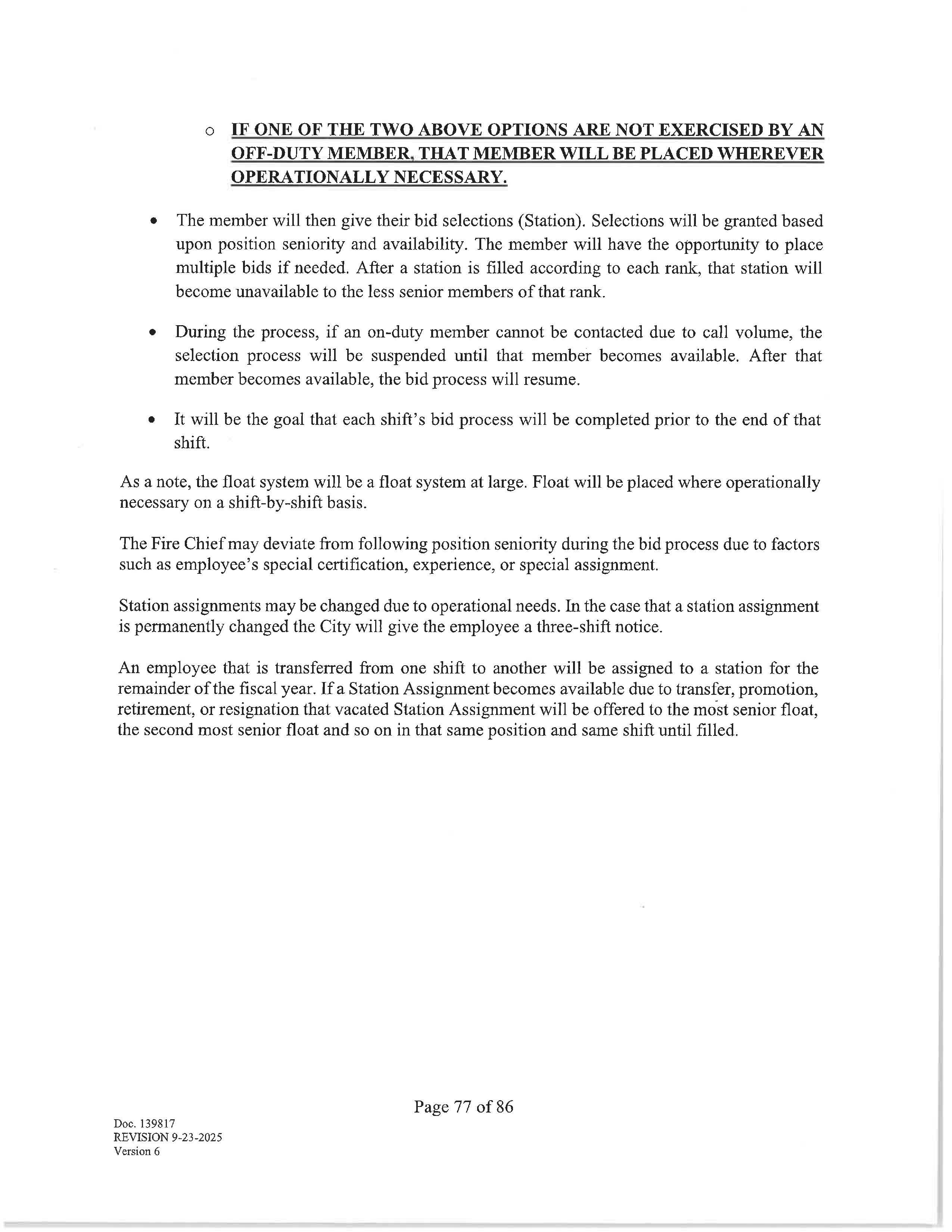 o IF ONE OF THE TWO ABOVE OPTIONS ARE NOT EXERCISED BY AN OFF-DUTY MEMBER. THAT MEMBER WILL BE PLACED WHEREVER OPERATIONALLY NECESSARY.