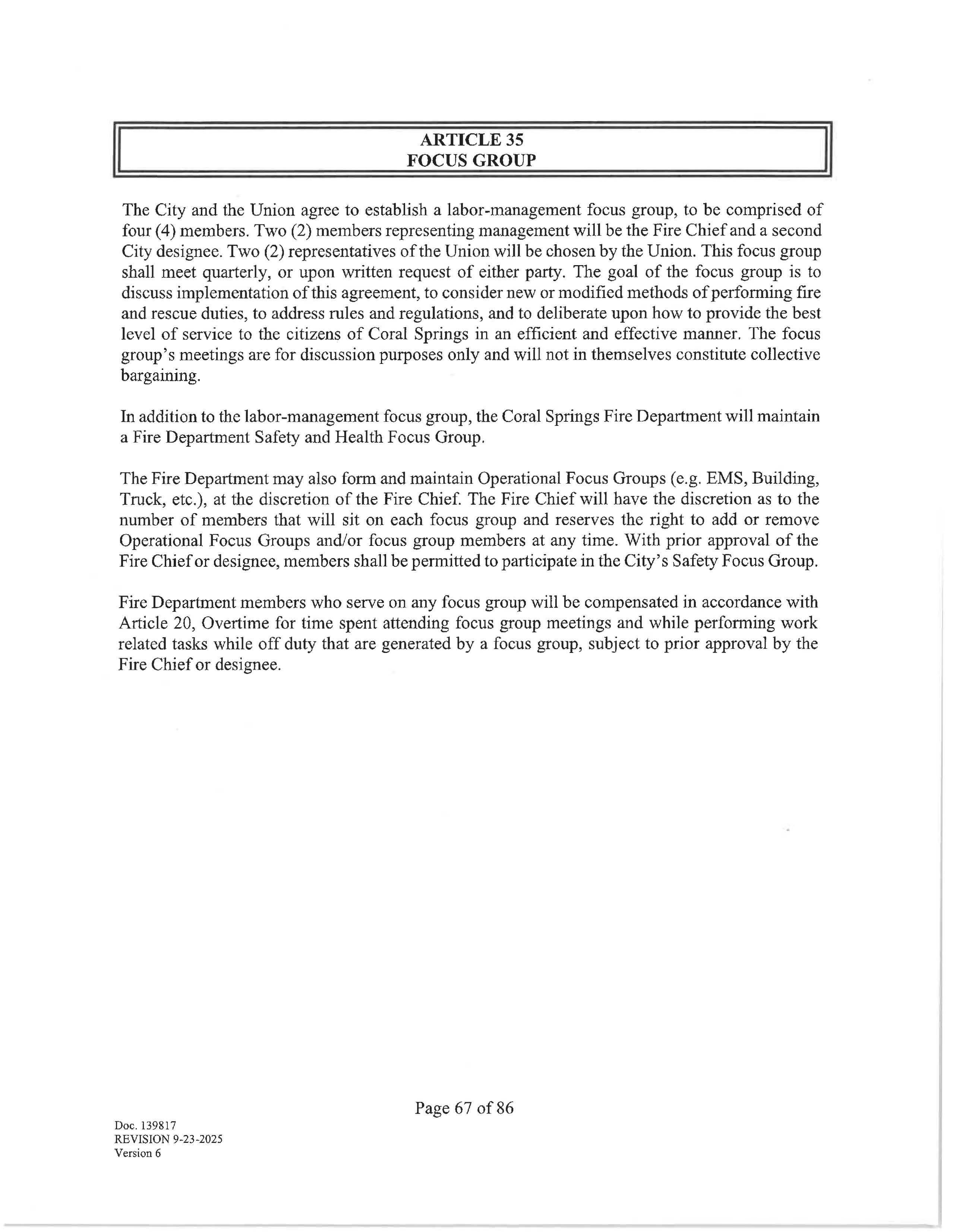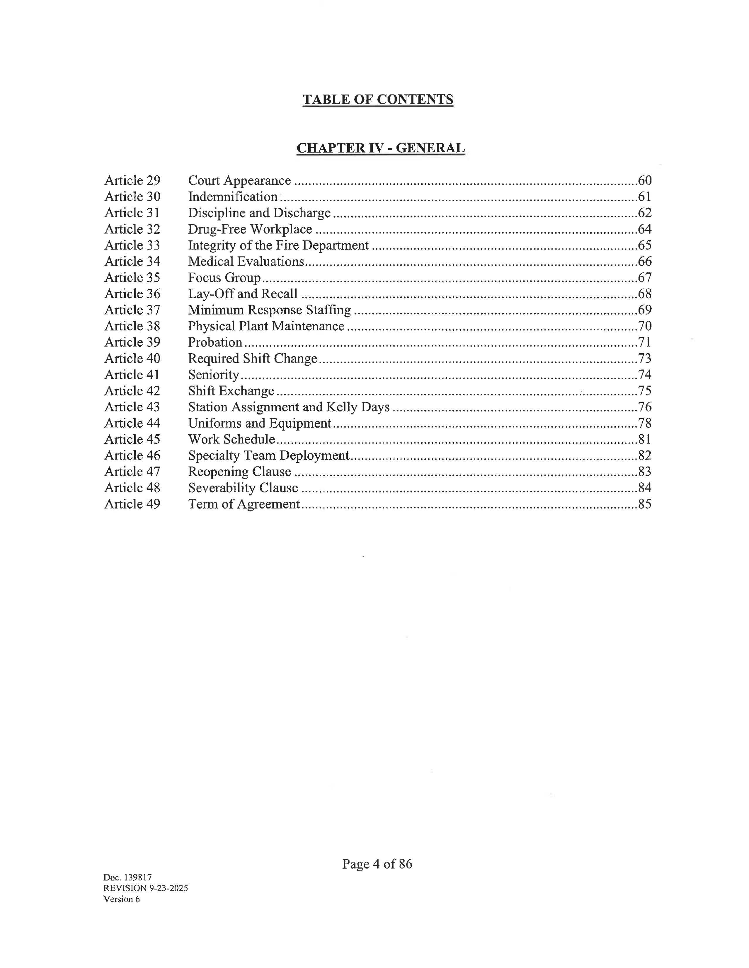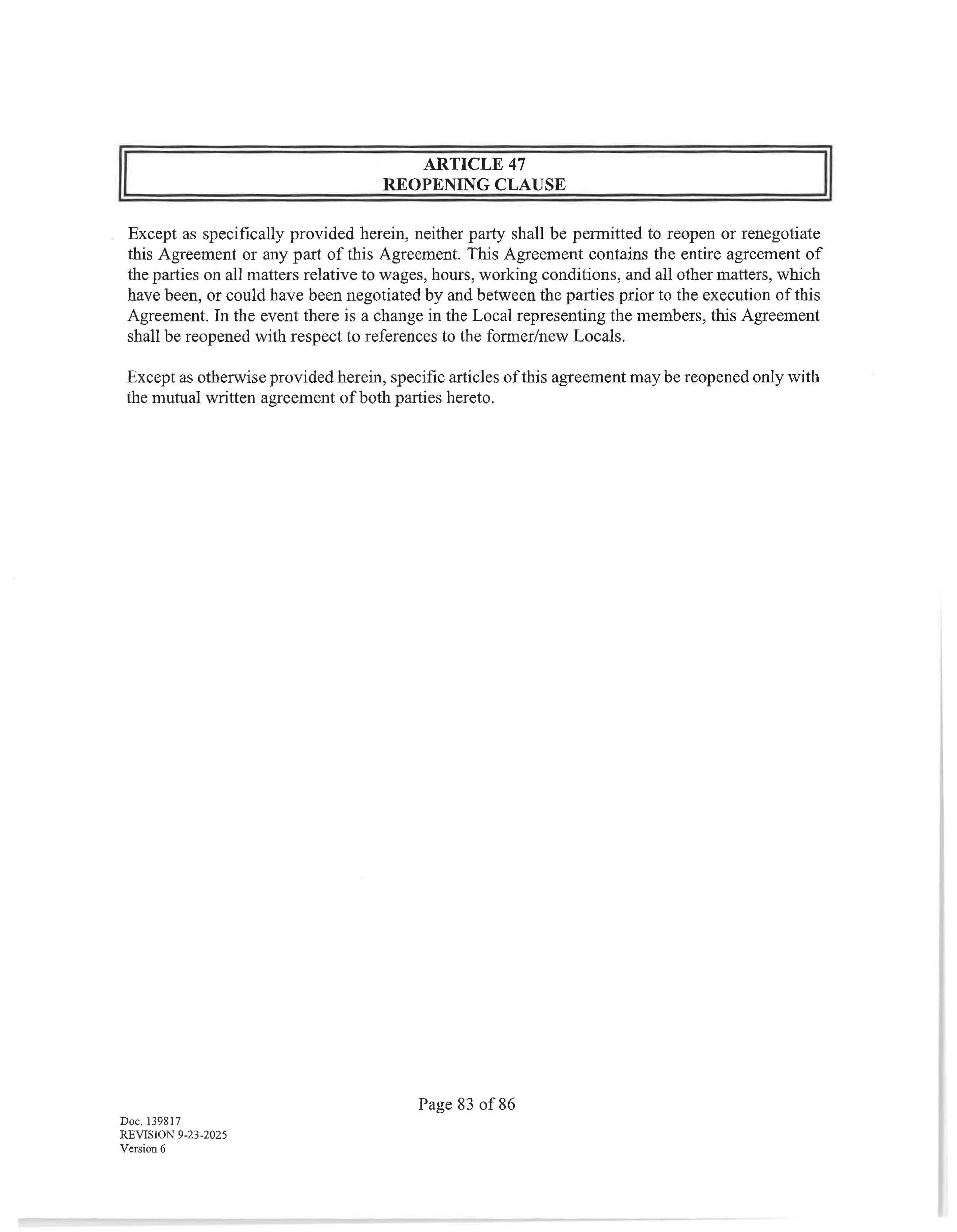 Except as otherwise provided herein, specific articles of this agreement may be reopened only with the mutual written agreement of both parties hereto. Doc. 139817 REVISION 9-23-2025