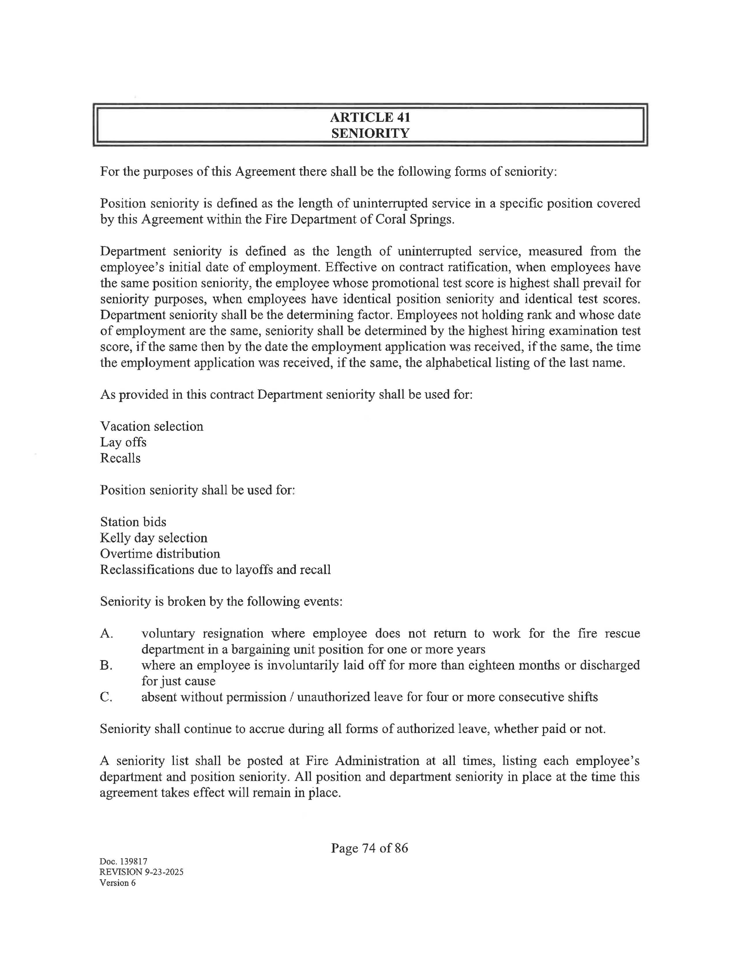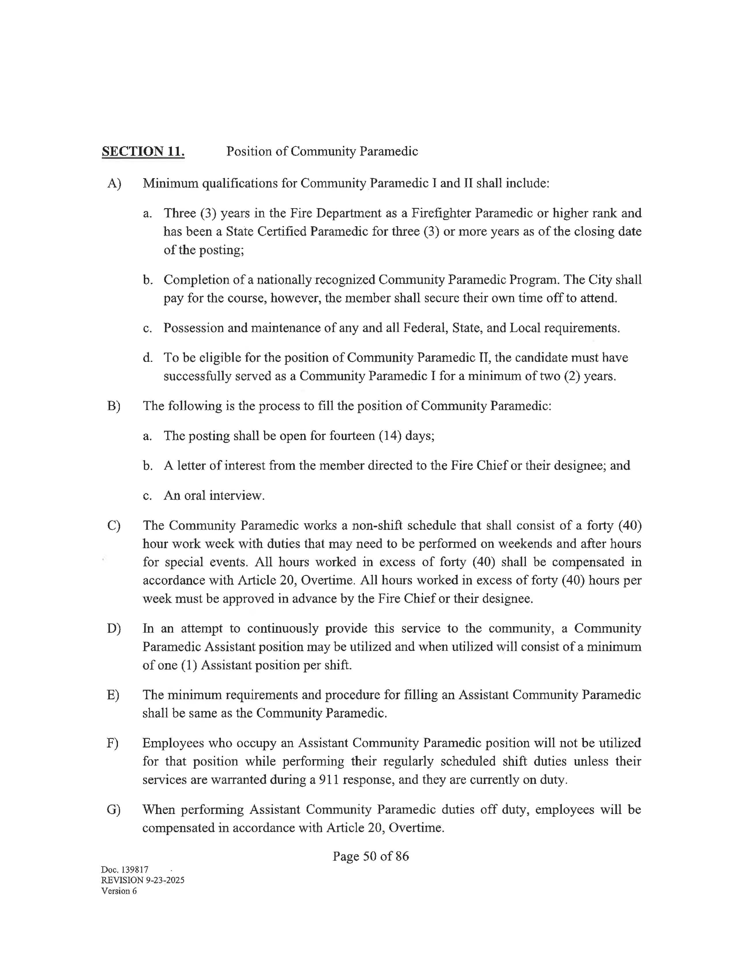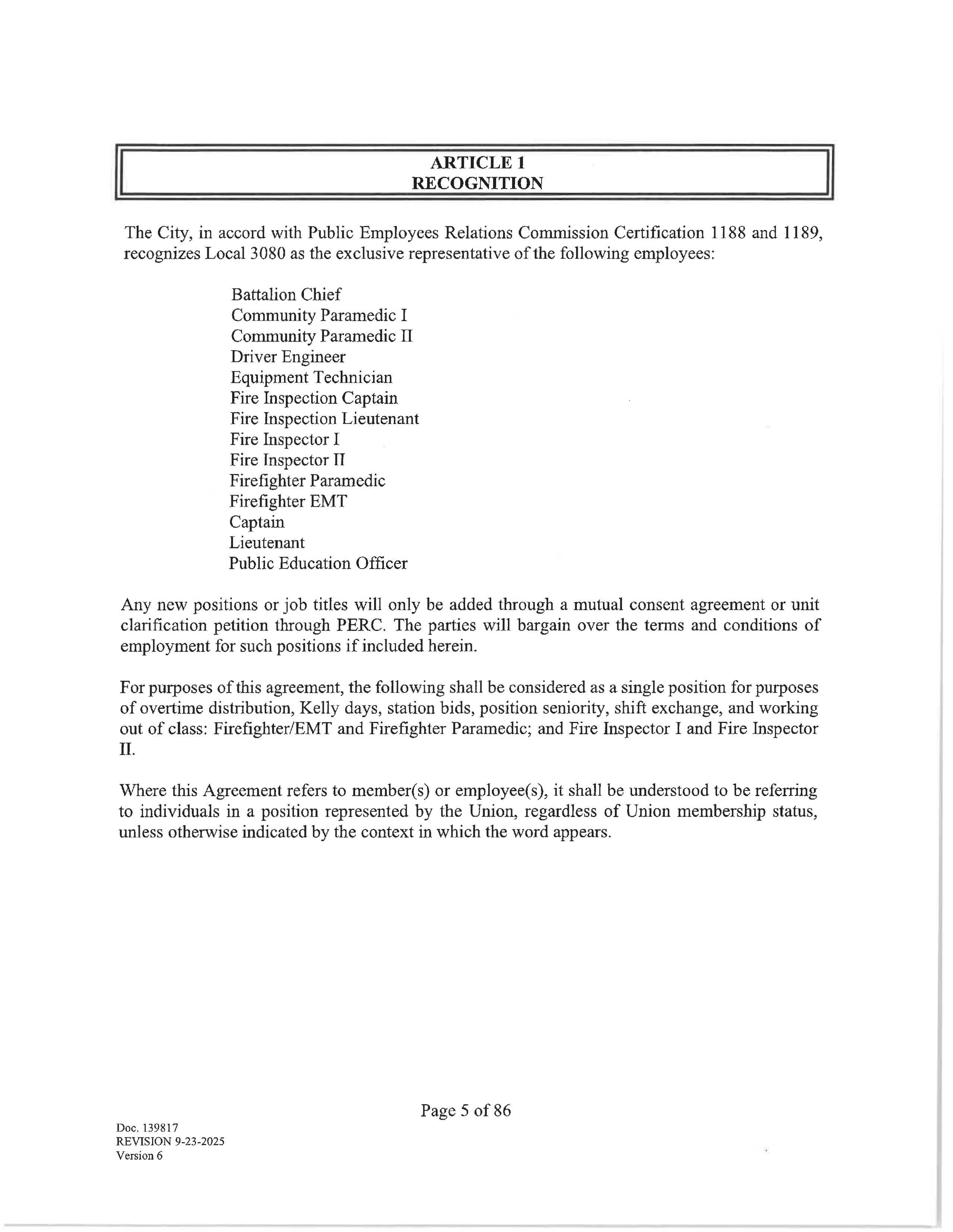For purposes of this agreement, the following shall be considered as a single position for purposes of overtime distribution, Kelly days, station bids, position seniority, shift exchange, and working out of class: Firefighter/EMT and Firefighter Paramedic; and Fire Inspector I and Fire Inspector II.