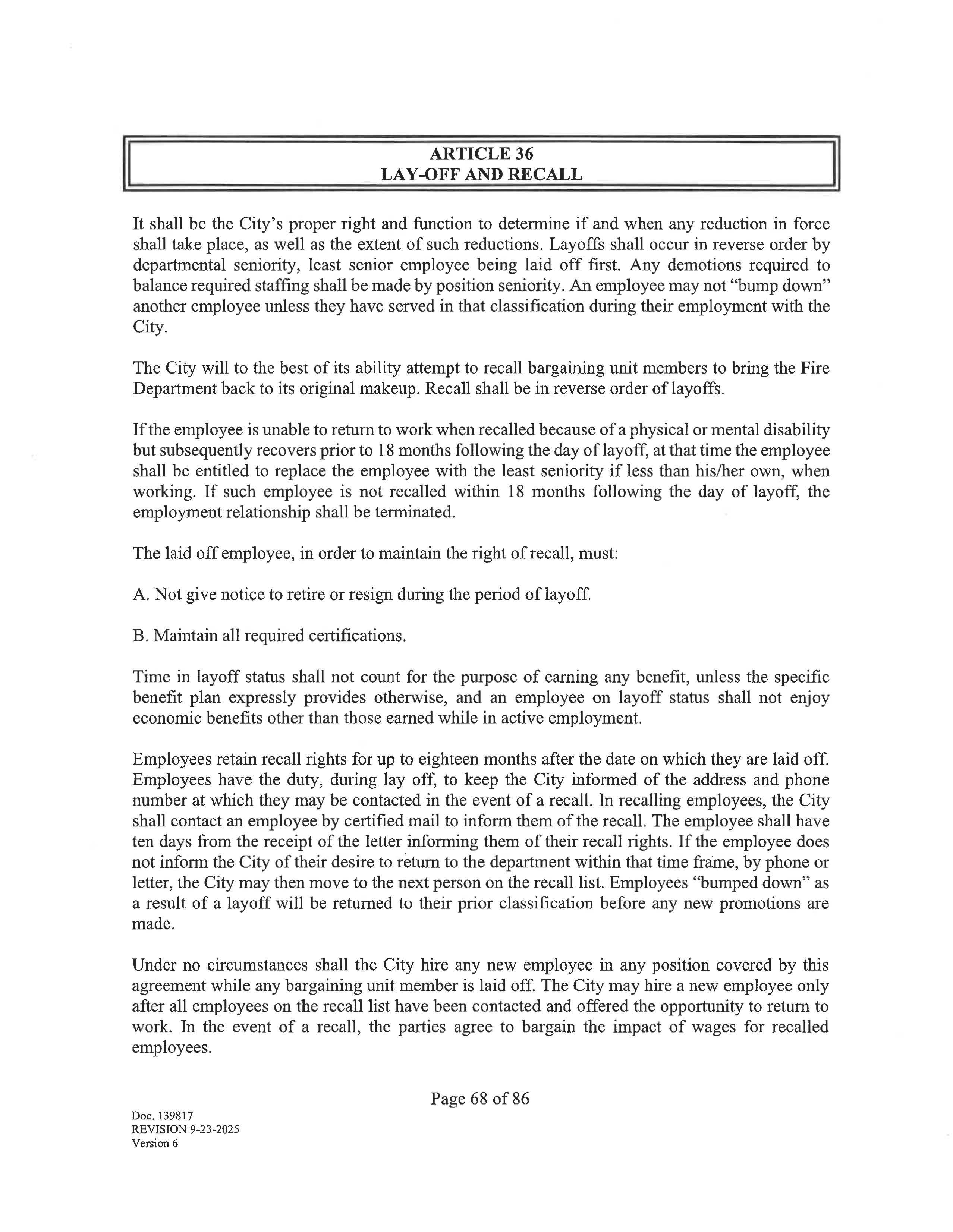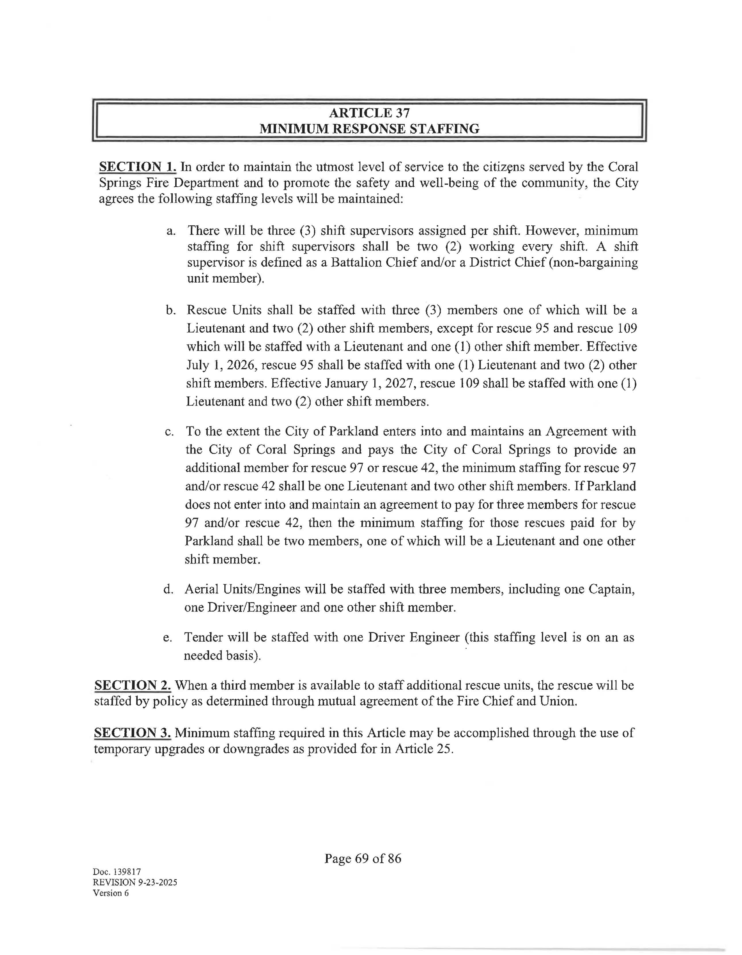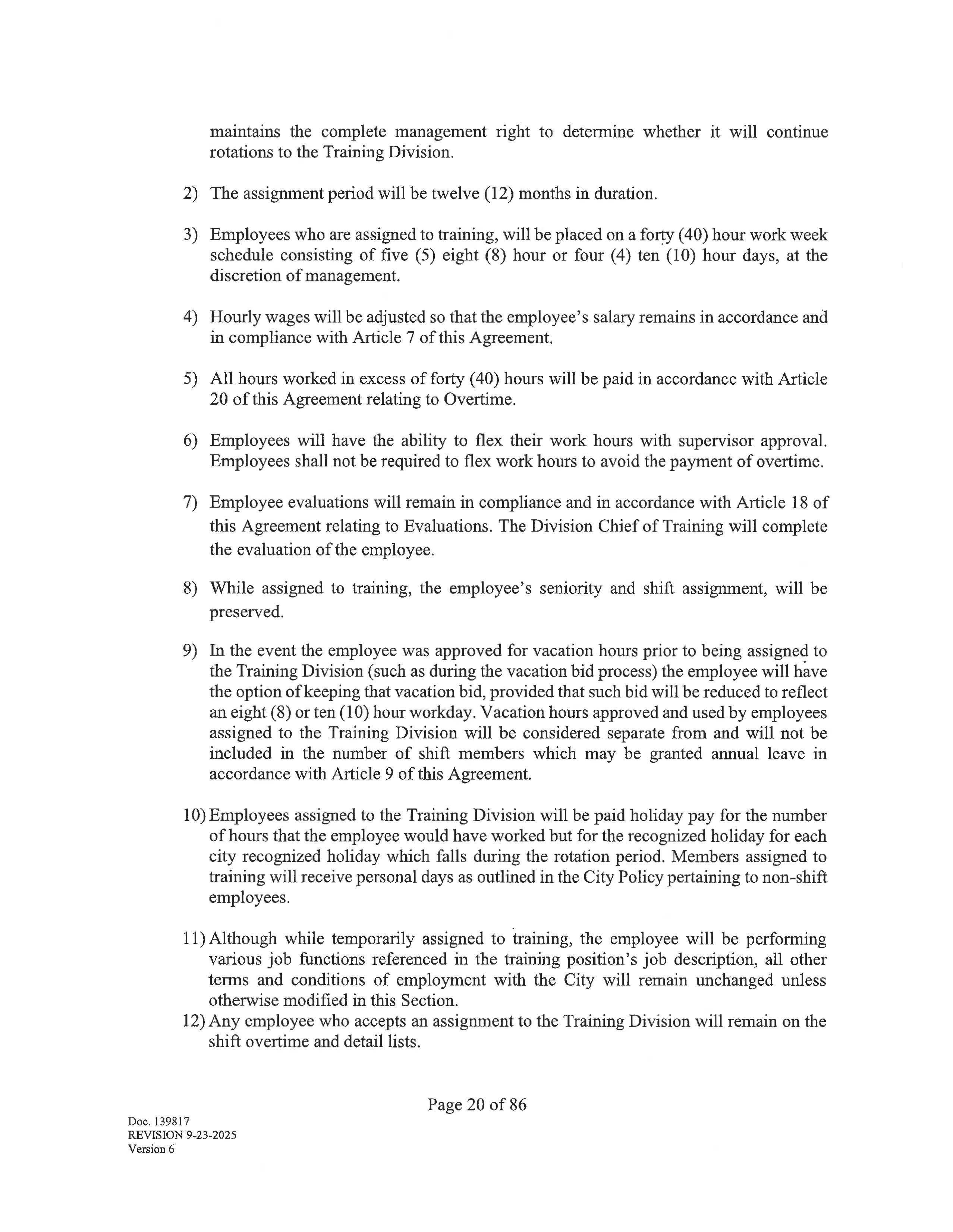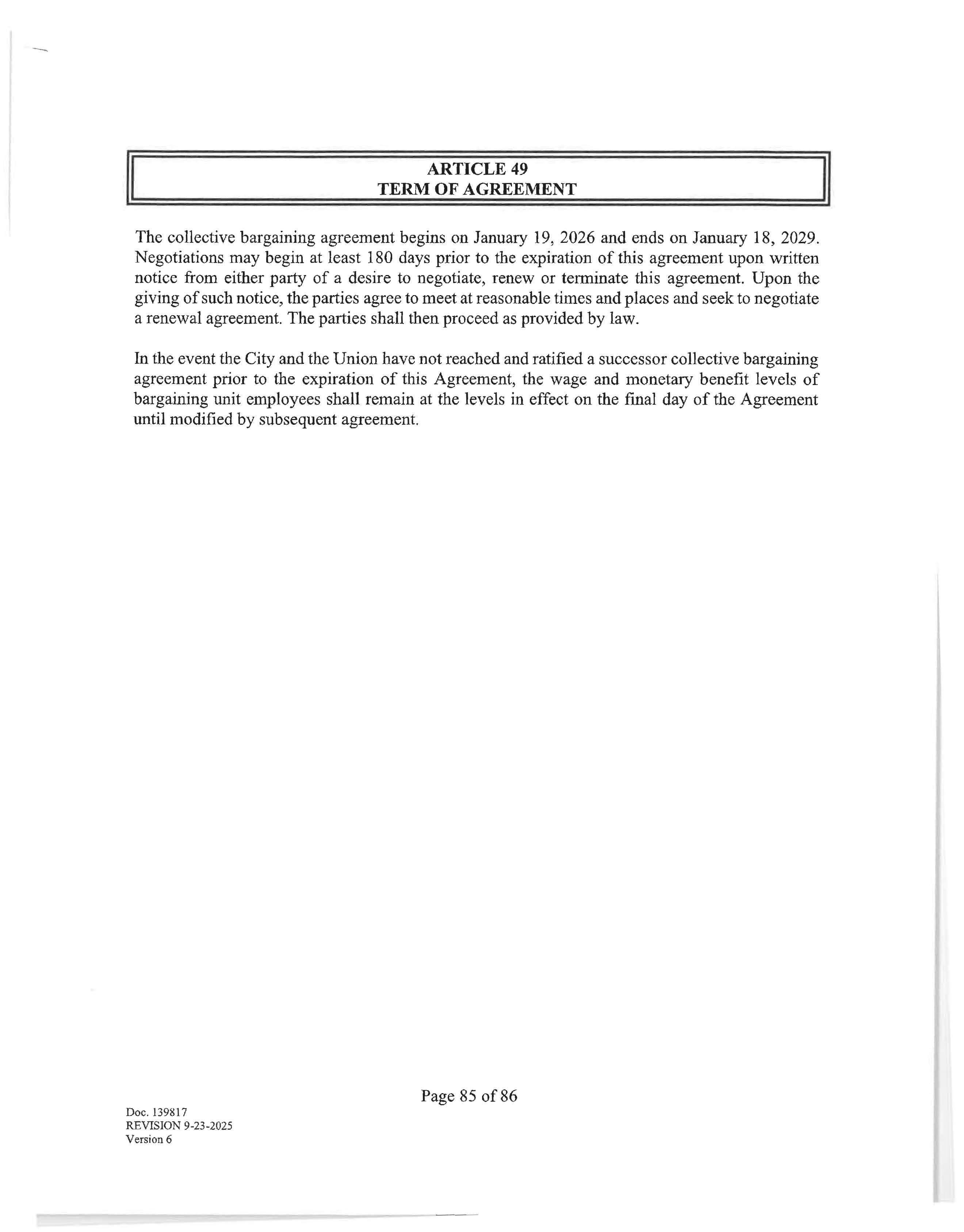 The collective bargaining agreement begins on January 19, 2026 and ends on January 18, 2029. Negotiations may begin at least 180 days prior to the expiration of this agreement upon written notice from either party of a desire to negotiate, renew or terminate this agreement. Upon the giving of such notice, the parties agree to meet at reasonable times and places and seek to negotiate a renewal agreement. The parties shall then proceed as provided by law.