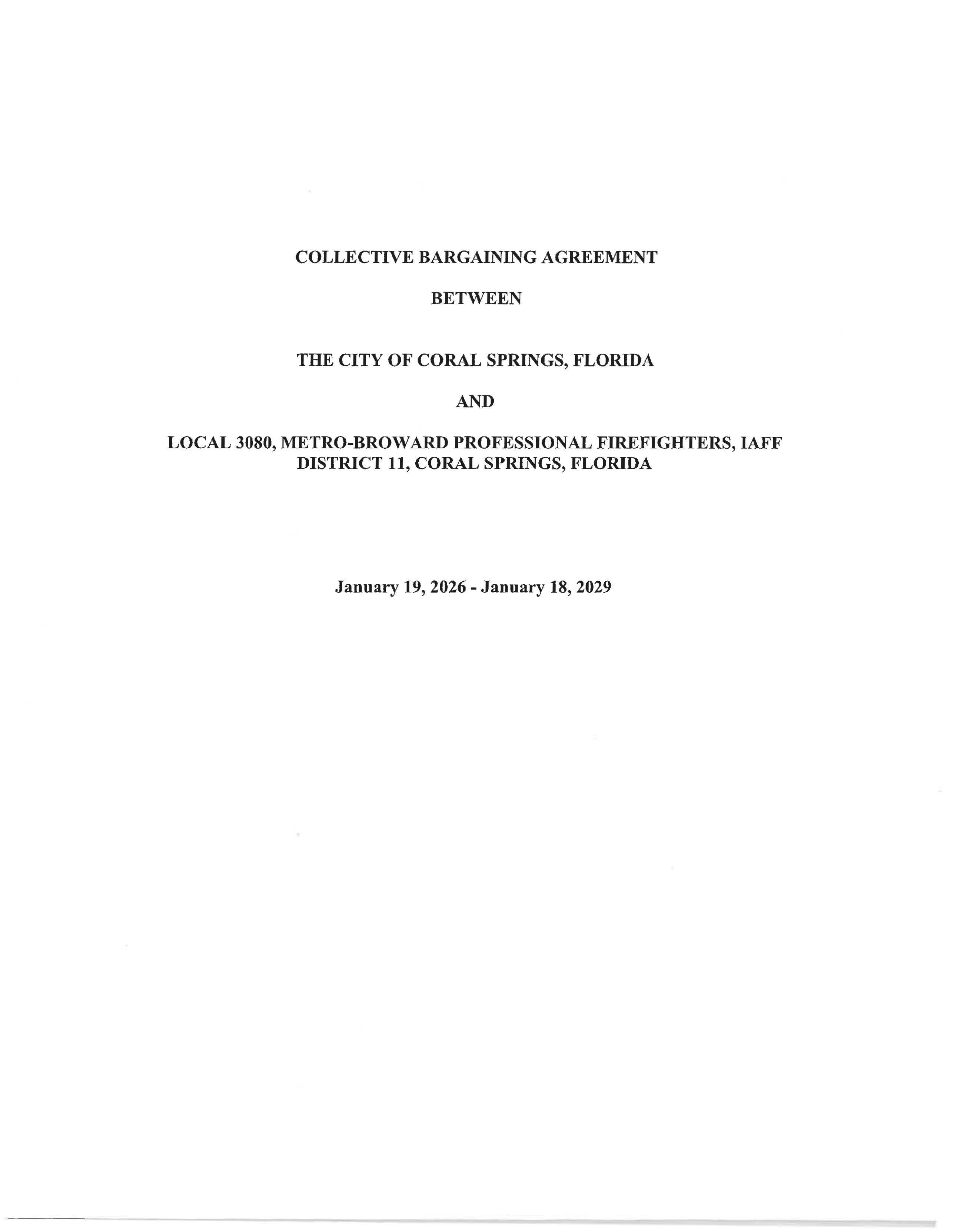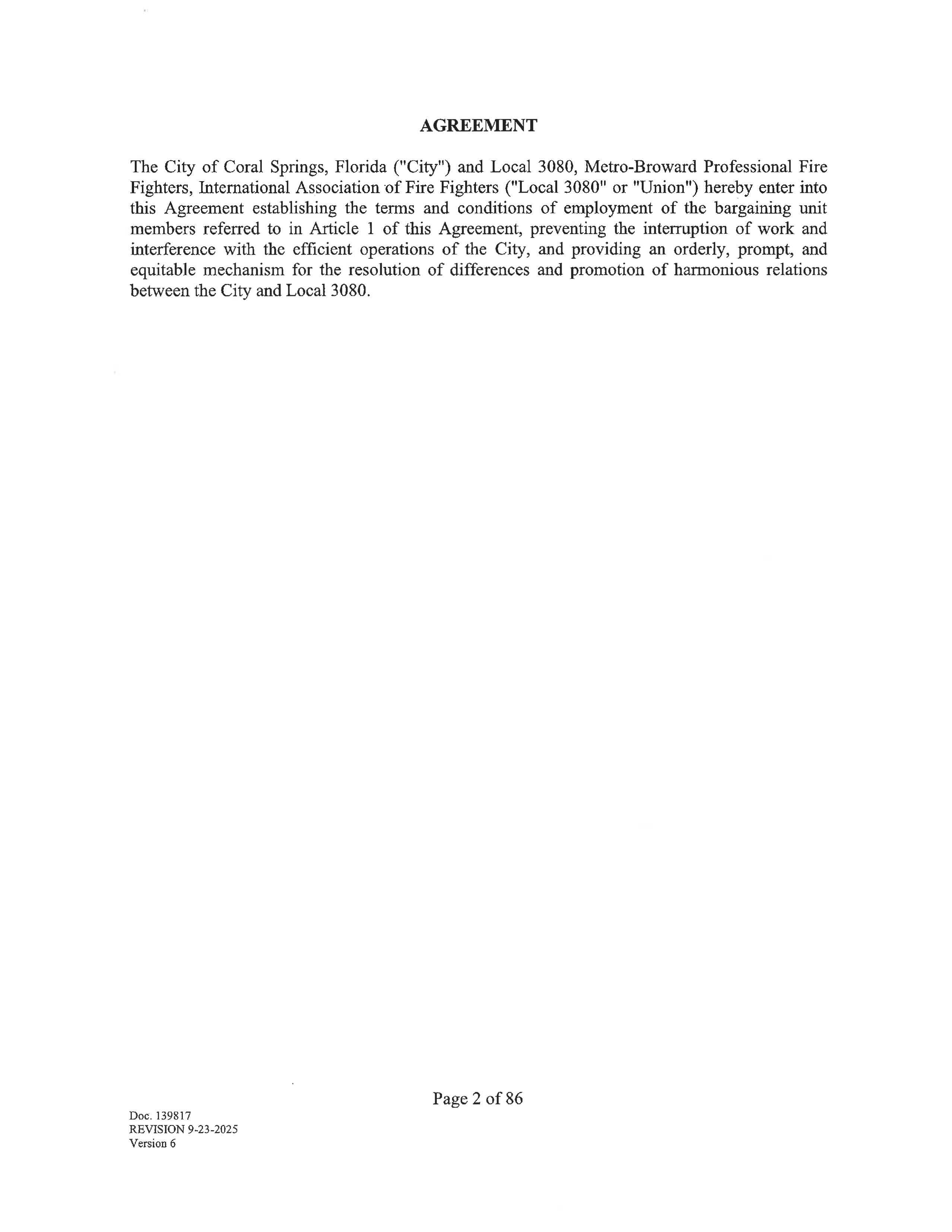 The City of Coral Springs, Florida ("City") and Local 3080, Metro-Broward Professional Fire Fighters, International Association -of Fire Fighters ("Local 3080" or "Union") hereby enter into this Agreement establishing the terms and conditions of employment of the bargaining unit members referred to in Article 1 of this Agreement, preventing the interruption of work and interference with the efficient operations of the City, and providing an orderly, prompt, and equitable mechanism for the resolution of differences and promotion of harmonious relations between the City and Local 3080.