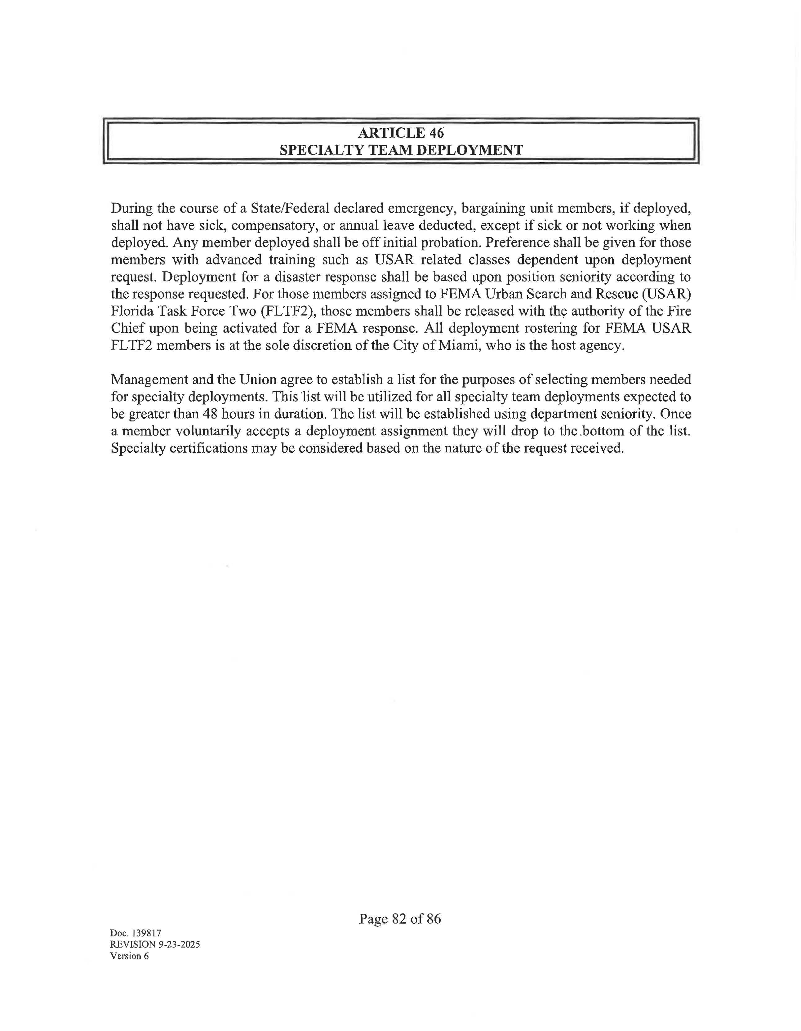 During the course of a State/Federal declared emergency, bargaining unit members, if deployed, shall not have sick, compensatory, or annual leave deducted, except if sick or not working when deployed. Any member deployed shall be off initial probation. Preference shall be given for those members with advanced training such as USAR related classes dependent upon deployment request. Deployment for a disaster response shall be based upon position seniority according to the response requested. For those members assigned to FEMA Urban Search and Rescue (USAR) Florida Task Force Two (FLTF2), those members shall be released with the authority of the Fire Chief upon being activated for a FEMA response. All deployment rostering for FEMA USAR FLTF2 members is at the sole discretion of the City of Miami, who is the host agency.