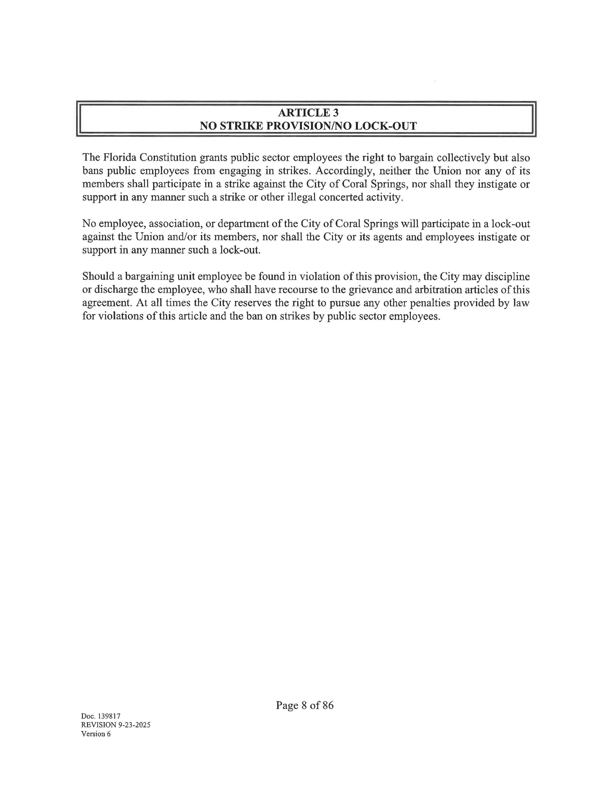 The Florida Constitution grants public sector employees the right to bargain collectively but also bans public employees from engaging in strikes. Accordingly, neither the Union nor any of its members shall participate in a strike against the City of Coral Springs, nor shall they instigate or support in any manner such a strike or other illegal concerted activity.
