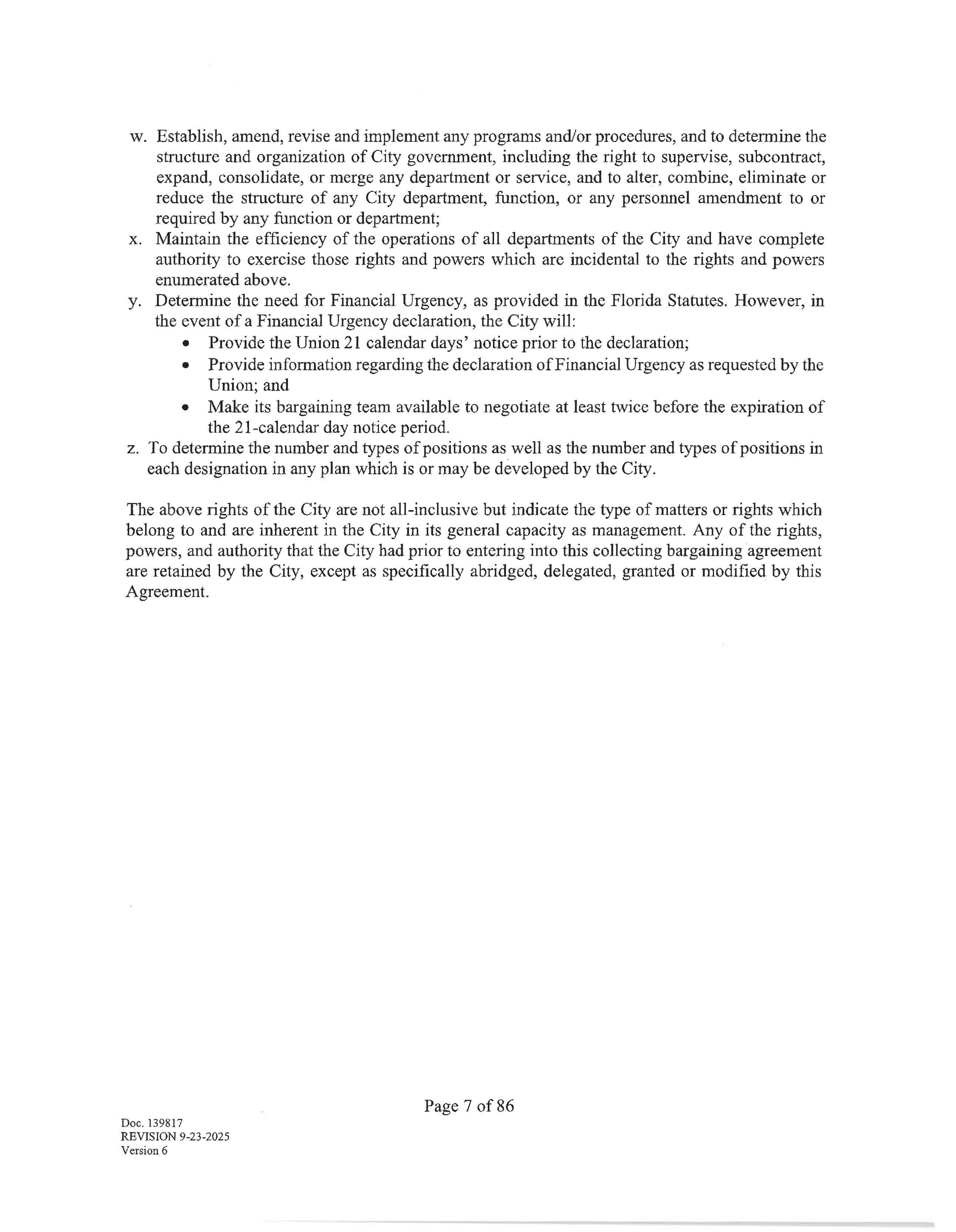y. Determine the need for Financial Urgency, as provided in the Florida Statutes. However, in the event of a Financial Urgency declaration, the City will: