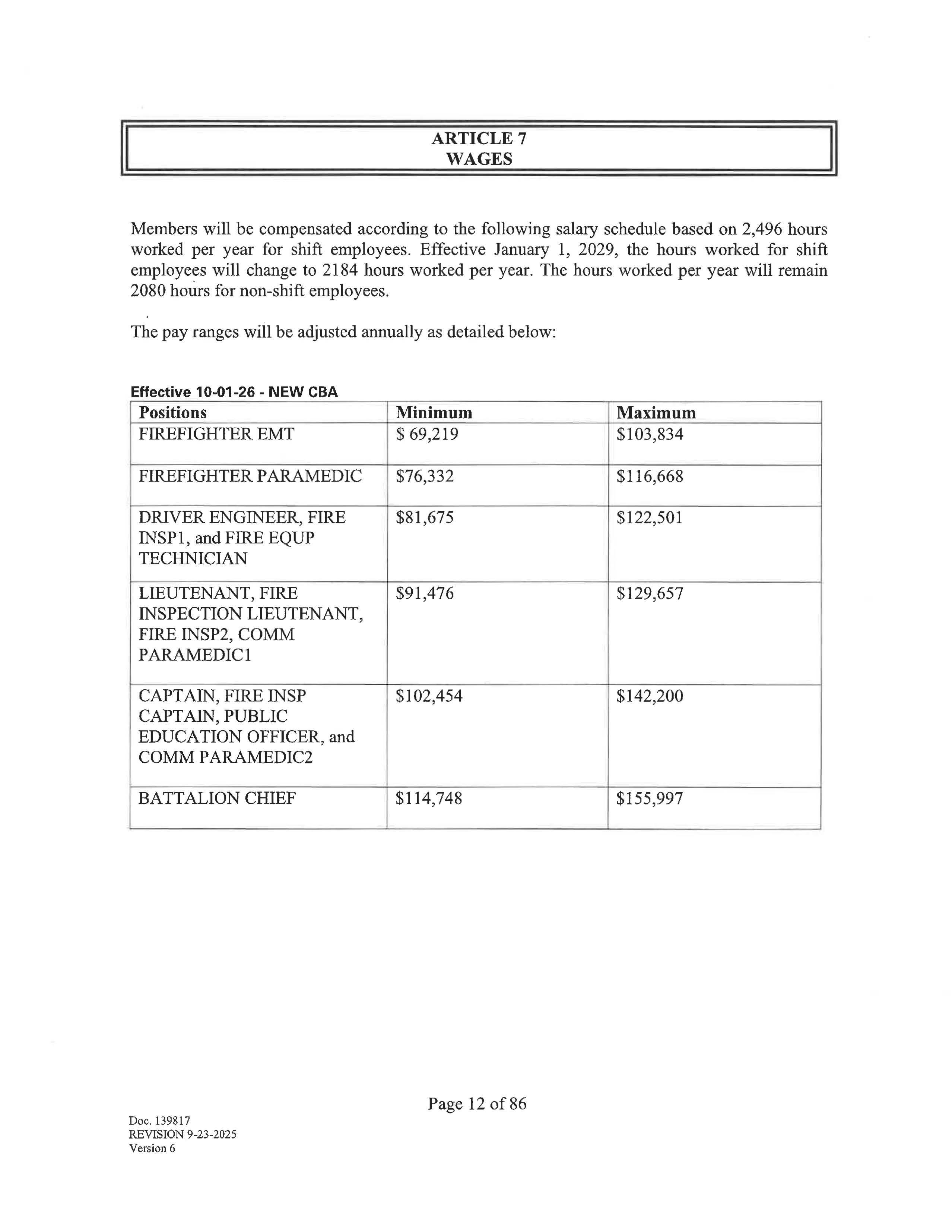 Members will be compensated according to the following salary schedule based on 2,496 hours worked per year for shift employees. Effective January 1, 2029, the hours worked for shift employees will change to 2184 hours worked per year. The hours worked per year will remain 2080 hours for non-shift employees.