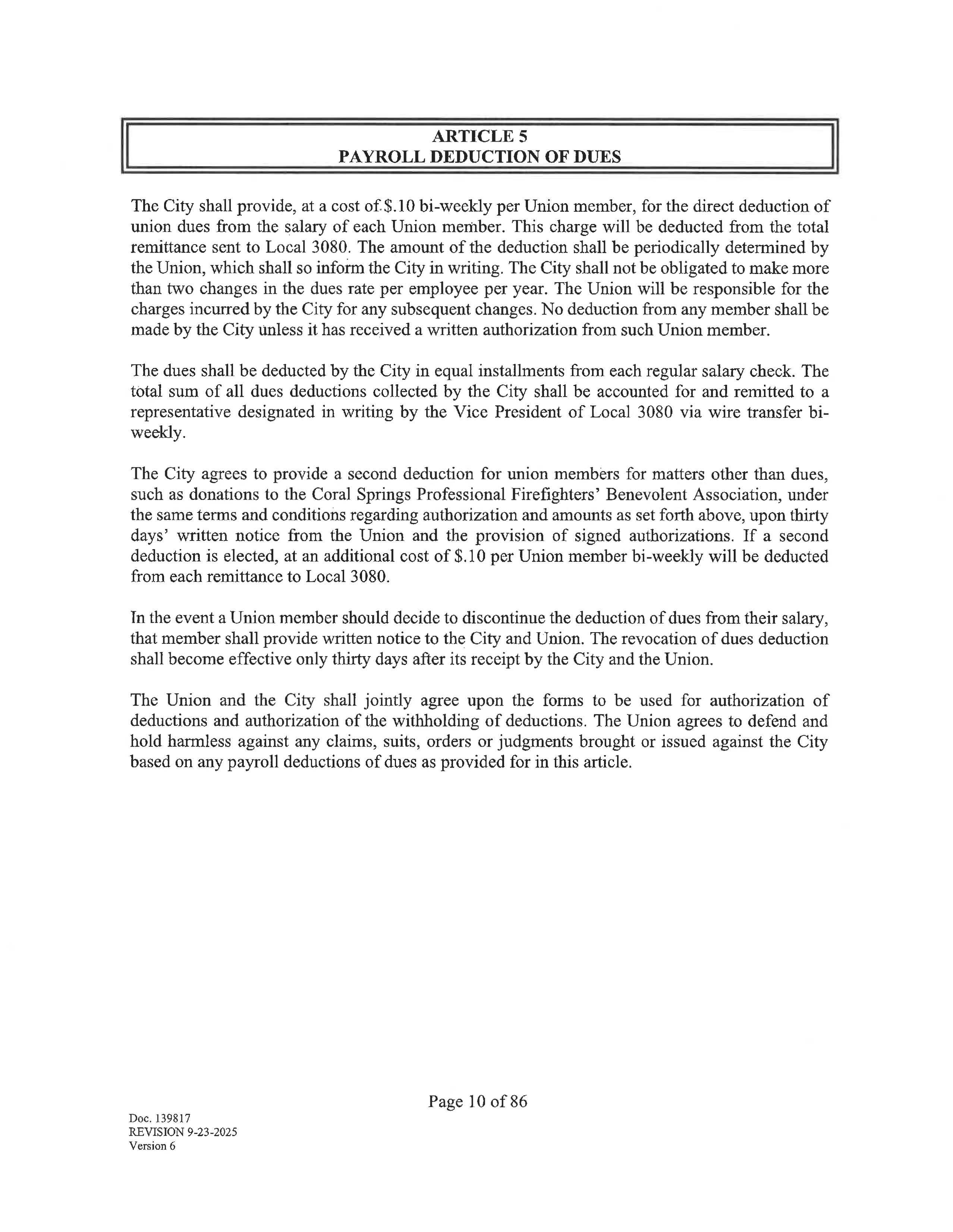 The City agrees to provide a second deduction for union members for matters other than dues , such as donations to the Coral Springs Professional Firefighters' Benevolent Association, under the same terms and conditions regarding authorization and amounts as set forth above, upon thirty days' written notice from the Union and the provision of signed authorizations. If a second deduction is elected, at an additional cost of $.10 per Union member bi-weekly will be deducted from each remittance to Local 3080.