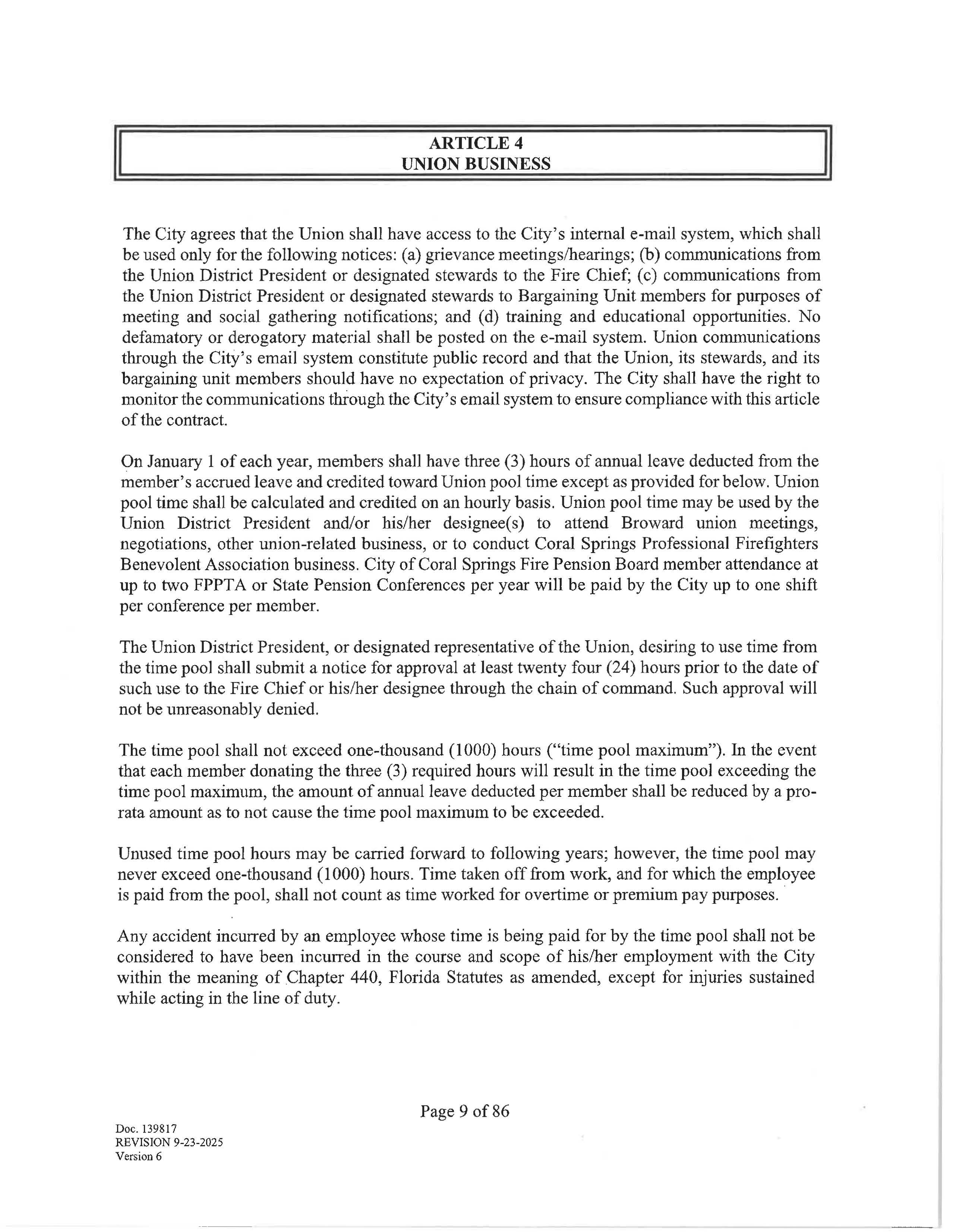 On January 1 of each year , members shall have three (3) hours of annual leave deducted from the member's accrued leave and credited toward Union pool time except as provided for below Union pool time shall be calculated and credited on an hourly basis. Union pool time may be used by the Union District President and/or his / her designee(s) to attend Broward union meetings, negotiations, other union-related business, or to conduct Coral Springs Professional Firefighters Benevolent Association business. City of Coral Springs Fire Pension Board member attendance at up to two FPPTA or State Pension Conferences per year will be paid by the City up to one shift per conference per member.