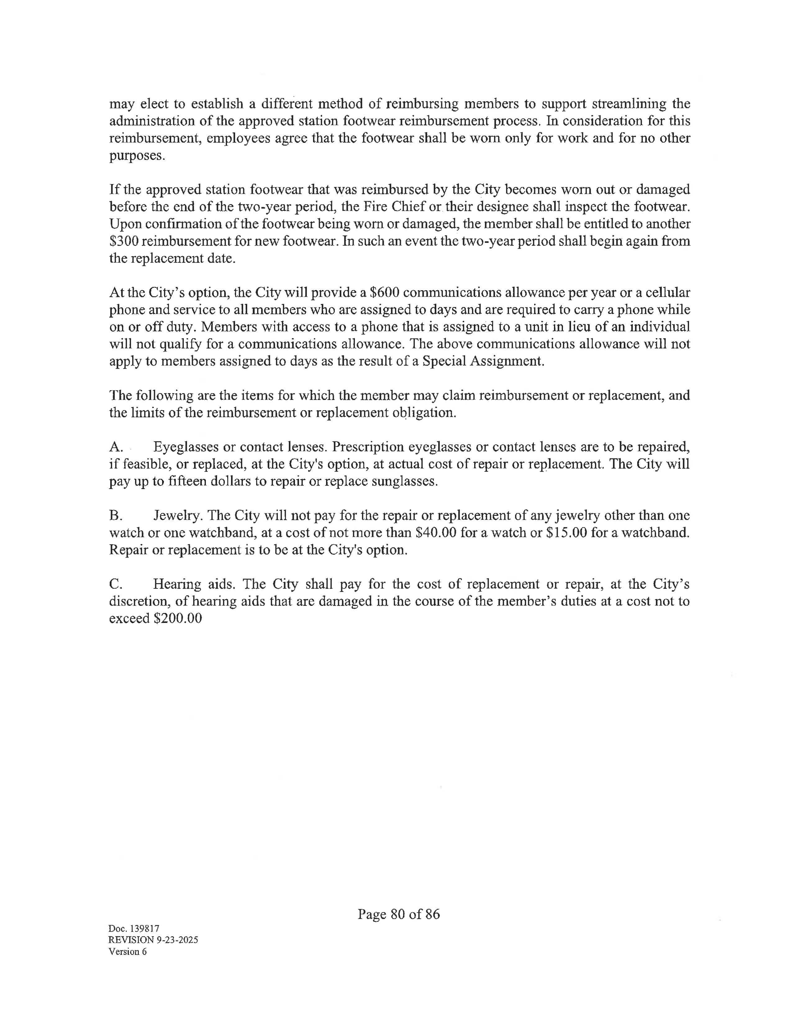 If the approved station footwear that was reimbursed by the City becomes worn out or damaged before the end of the two-year period, the Fire Chief or their designee shall inspect the footwear. Upon confirmation of the footwear being worn or damaged, the member shall be entitled to another $300 reimbursement for new footwear. In such an event the two-year period shall begin again from the replacement date.