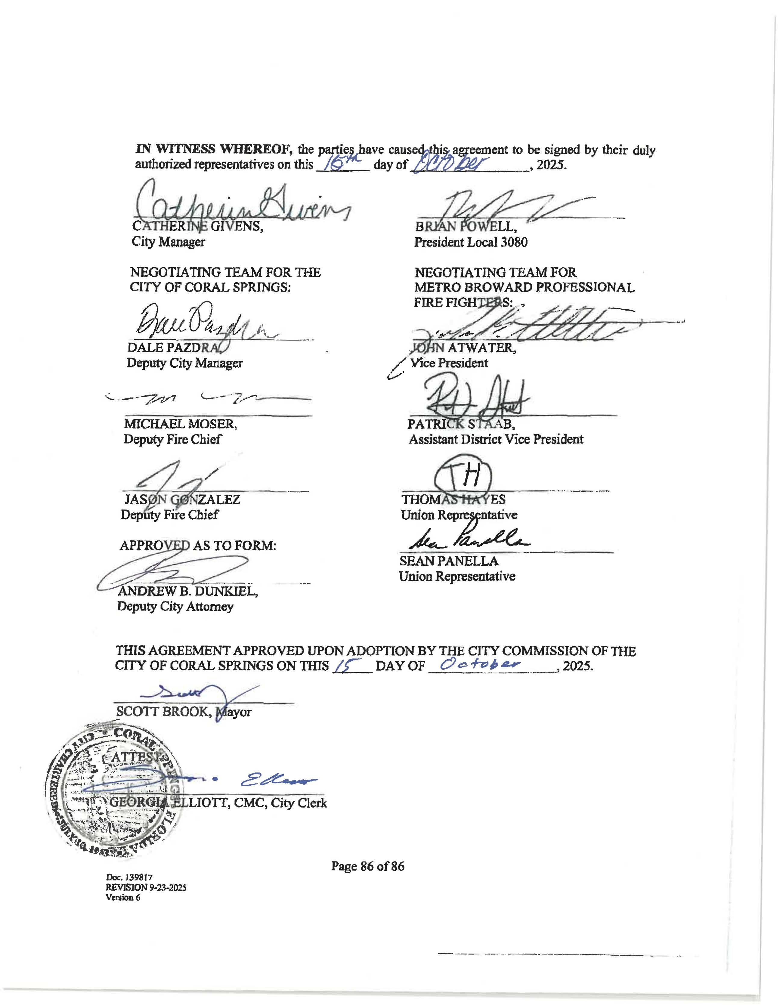 THIS AGREEMENT APPROVED UPON ADOPTION BY THE CITY COMMISSION OF THE CITY OF CORAL SPRINGS ON THIS IL DAY OF CJ c ~!1 a.r __, 2025.