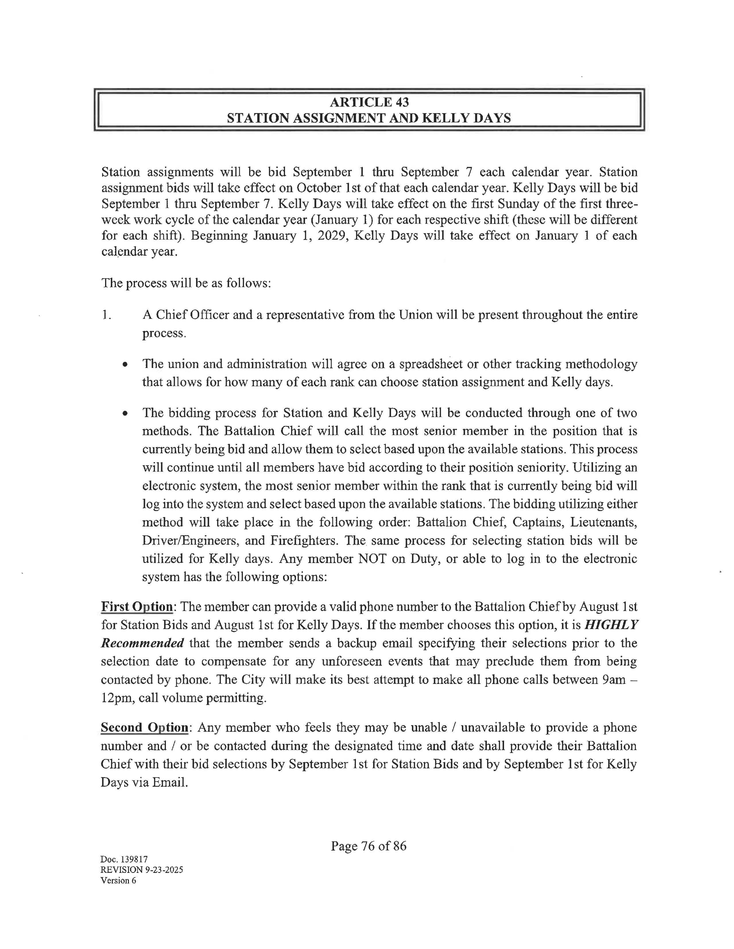 First Option: The member can provide a valid phone number to the Battalion Chief by August 1st for Station Bids and August 1st for Kelly Days. If the member chooses this op6on, it is HIGHLY Recommended that the member sends a backup email specifying their selections prior to the selection date to compensate for any unforeseen events that may preclude them from being contacted by phone. The City will make its best attempt to make all phone calls between 9am12pm, call volume permitting.